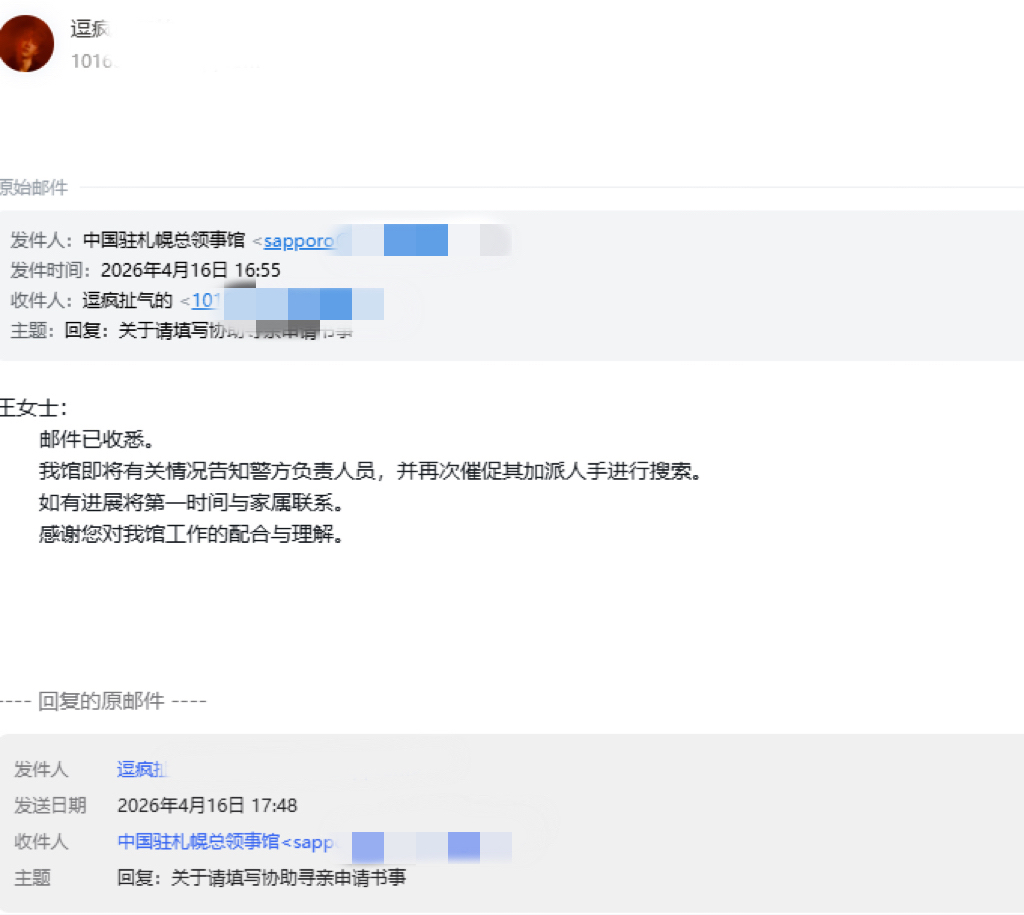 21日中午,记者拨通了中国驻札幌总领事馆的电话,工作人员确认了王潇在札幌失联一事,并表示“他的姐姐每天都打来询问进展”。领事馆在给王琪的邮件中明确表示:“我馆即将有关情况告知警方负责人员,并再次催促其加派人手进行搜索。如有进展将第一时间与家属联系。”