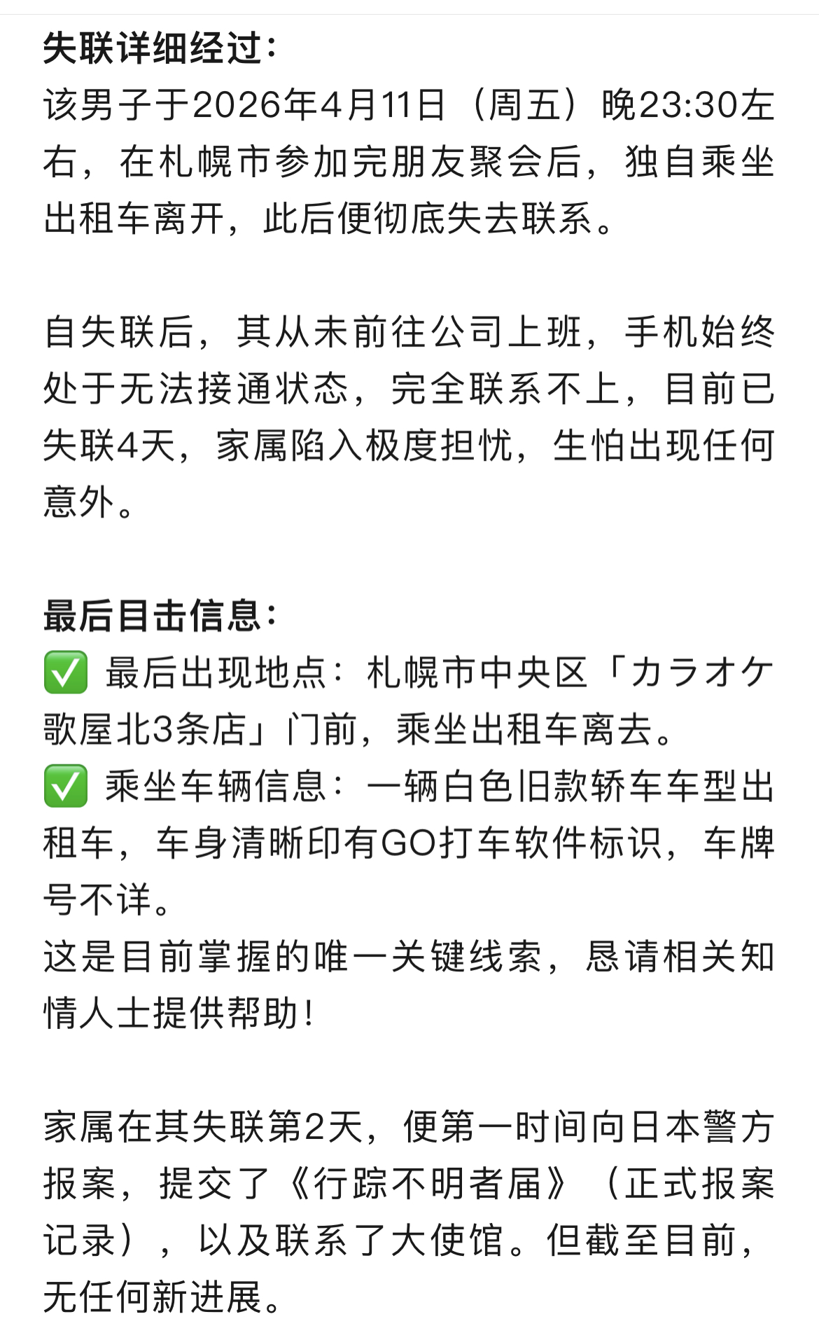 此前,他们掌握的唯一线索是——弟弟在札幌市中央区“KTV歌屋北3条店”门前,乘坐一辆出租车独自离开,车型为白色旧款轿车,车身清晰印有GO打车软件标识,车牌号不详。王琪告诉封面新闻记者,昨天(4月20日),警方又提供了一条线索,称弟弟下车的地点在札幌市“创成川通”附近。