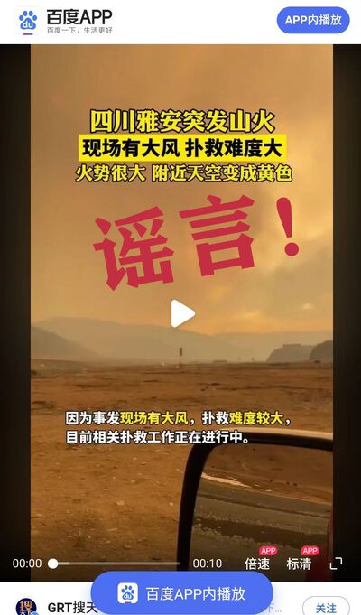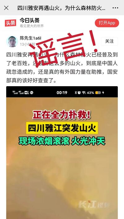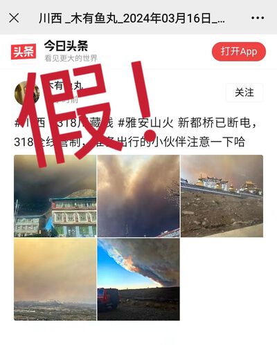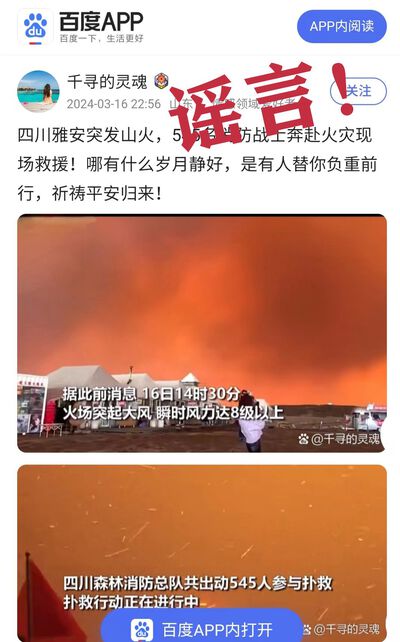 2024年3月15日17时许,四川甘孜州雅江县呷拉镇白孜村发生一起森林火灾。有网民将相关网络视频误认为是四川雅安发生大火,更有部分网民未经核实,便在抖音、百度等平台发布“四川雅安突发山火”等谣言信息,引发关注。经核实,雅安市境内无此事发生,请广大市民群众切勿信谣传谣!
