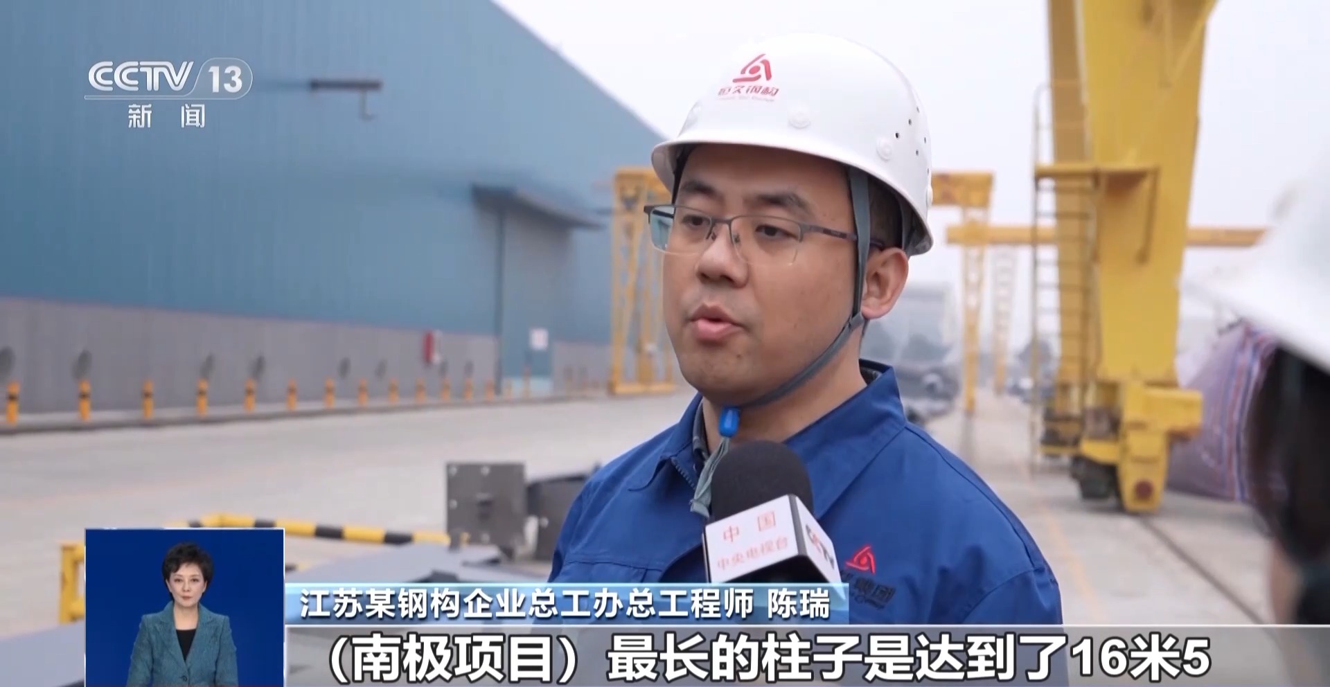 江苏某钢构企业总工办总工程师 陈瑞:(南极项目)最长的柱子是达到了16米5,比这根柱子可能要长一倍,常规的标准一般就是在十二米以内。运输的这个难度也都是增大的,对于我们加工要求也是更高了。