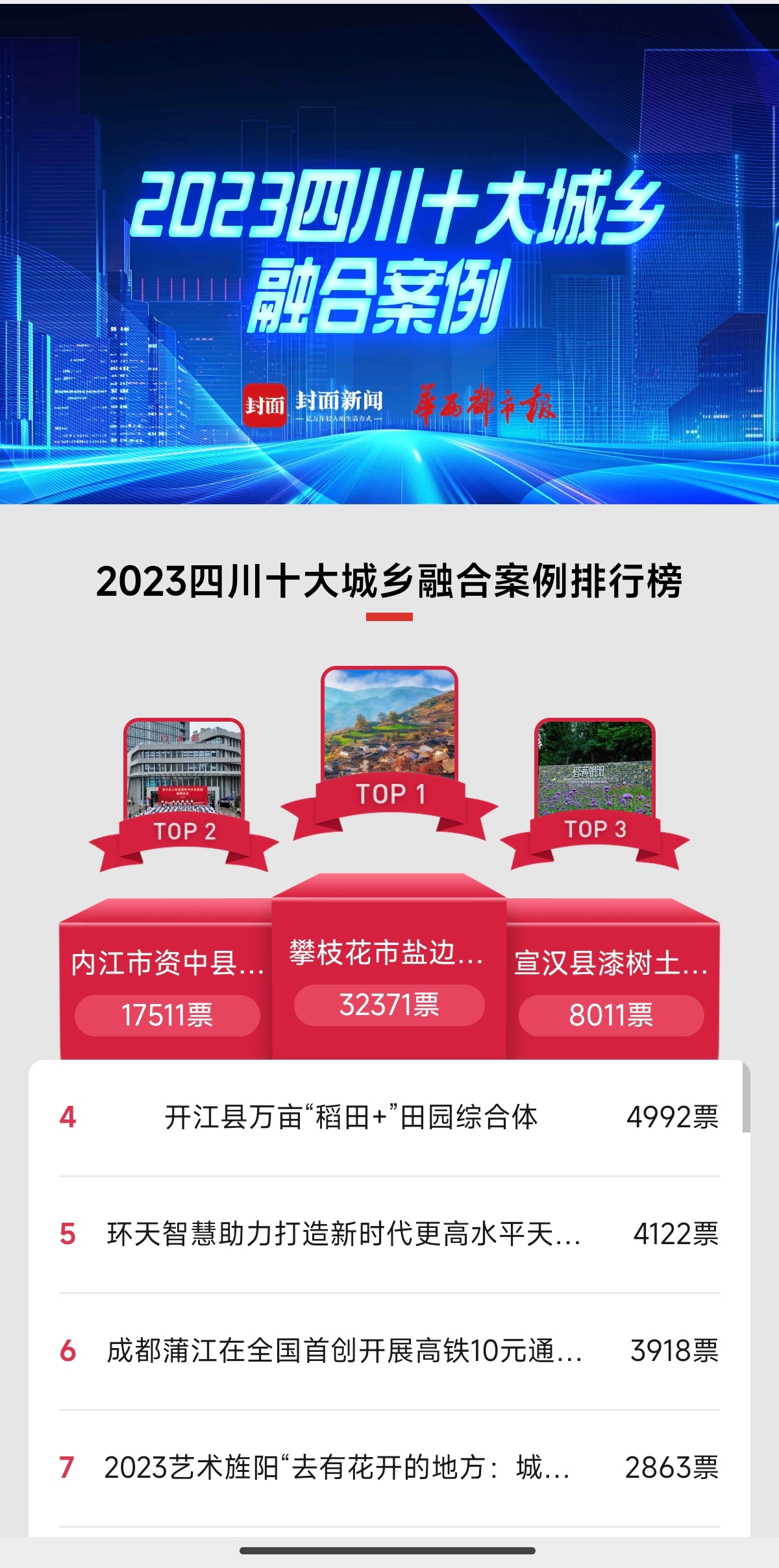 从参选的案例介绍中可以发现,无论是园区、景区,还是街道、乡村,都在用自己的方式探索推进城乡融合发展,也吸引了众多网友为其打Call助力。据统计,截至3月13日18:00,为城乡融合案例的投票数已达22万。其中,攀枝花市盐边县红格镇联合村以3.2万余票暂居第一,内江市资中县紧密型县域医共体建设、宣汉县漆树土家族乡朝阳村紧随其后,分别位列第二、第三。