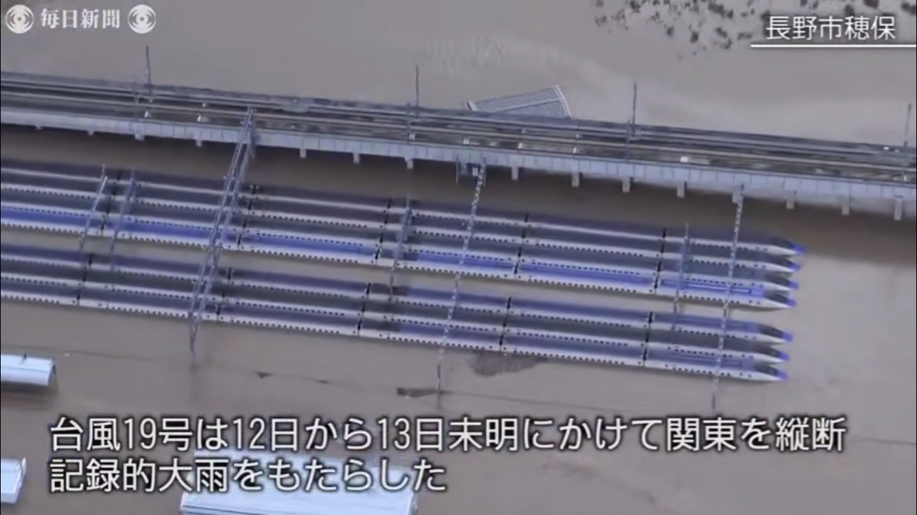在东日本铁路公司(JR东日本)的车辆中心,北陆新干线10节编组列车浸泡在水中。下水道处理设施也发生浸水,尚不清楚何时才能恢复。