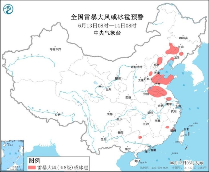 13日14时至14日14时,内蒙古东部、辽宁中部和北部、河北中东部、北京东北部、山东、河南北部和东部、安徽北部、江苏中北部、福建中东部、广东中南部沿海等地的部分地区将有8-10级雷暴大风或冰雹天气,局地风力可达11级以上;内蒙古东部、黑龙江西部和南部、吉林中部、辽宁西部、河北东北部、山东、河南东部、安徽北部、江苏北部、湖南南部、江西南部、浙江南部、福建、四川南部、云南东南部和中部、广西中南部、广东等地的部分地区将有短时强降水天气,小时雨量30-60毫米,局地可达80毫米以上。