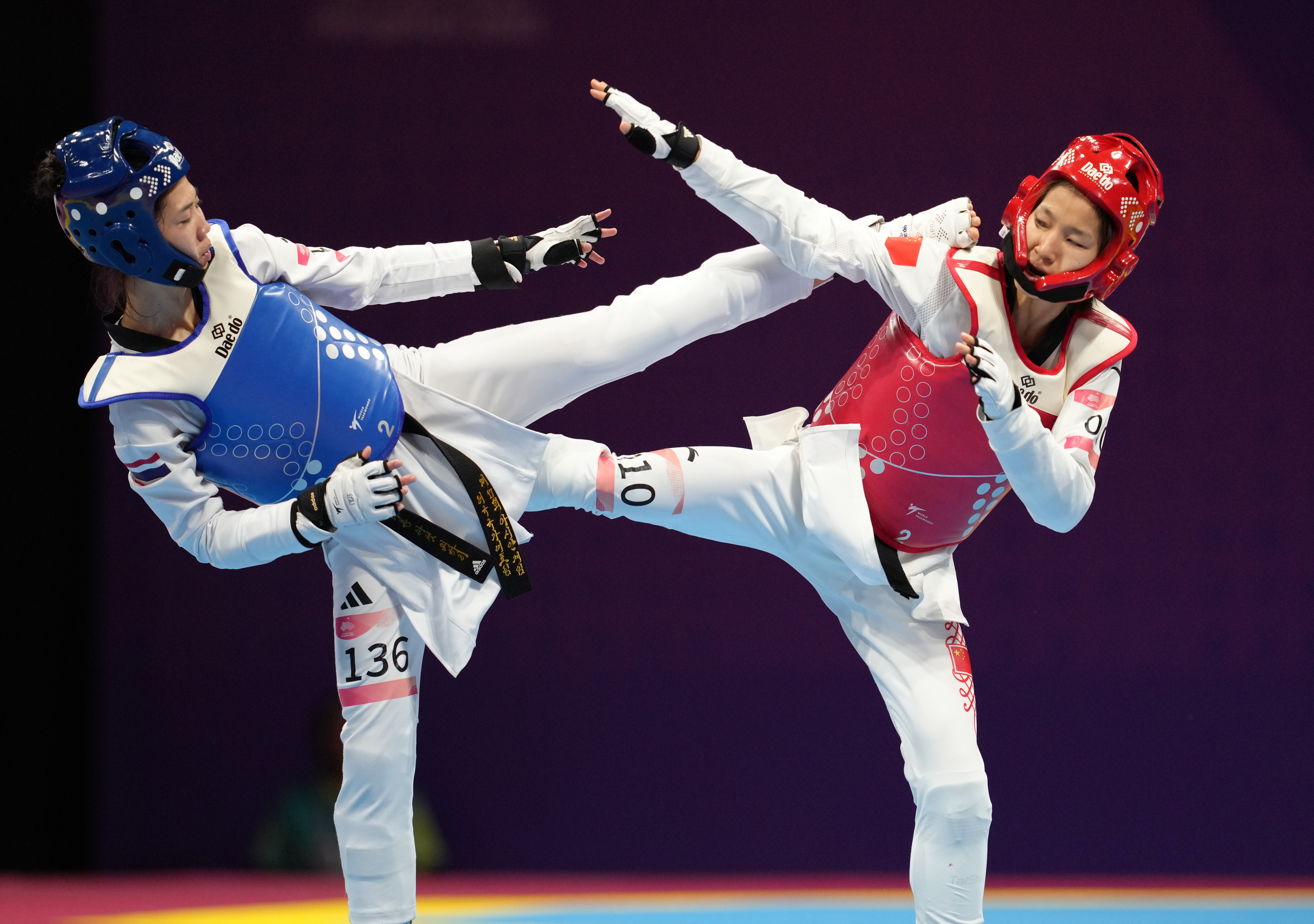 图为郭清(右)在杭州亚运会跆拳道项目女子49公斤级决赛中。新华社记者 江文耀 摄