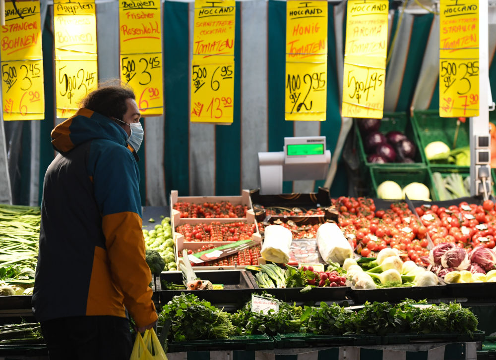2021年1月19日,在德国法兰克福,一名顾客在一处农贸市场选购食物。新华社记者逯阳摄