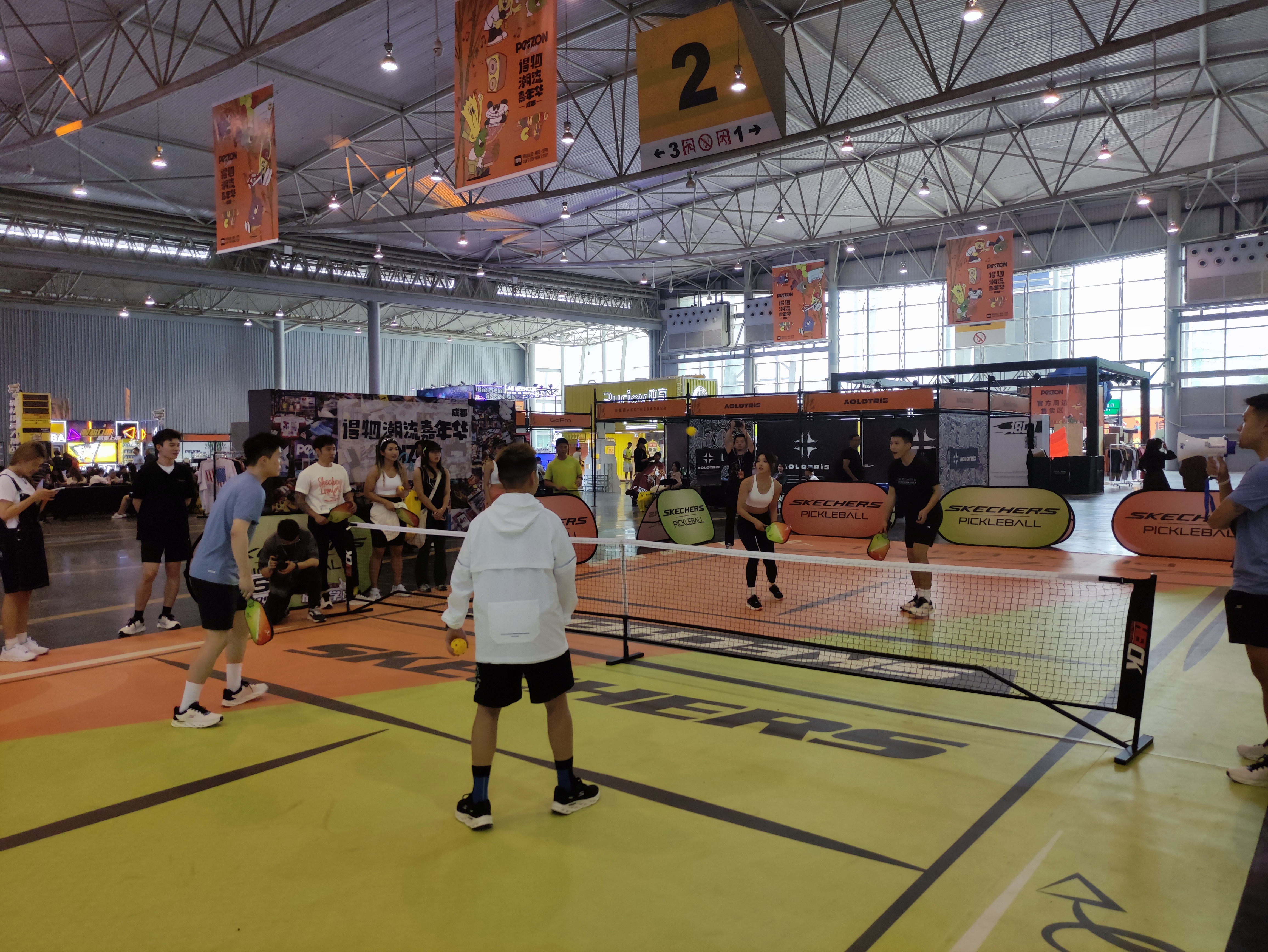 在斯凯奇展台,有一种与网球类似的运动比赛吸引了记者目光,不过场地比常见的网球略小,球拍也较网球短。据了解,这是一种名为皮卡球的休闲运动,又叫板式网球。因入门简单、玩法灵活、强社交性等特点,已在成都快速破圈。