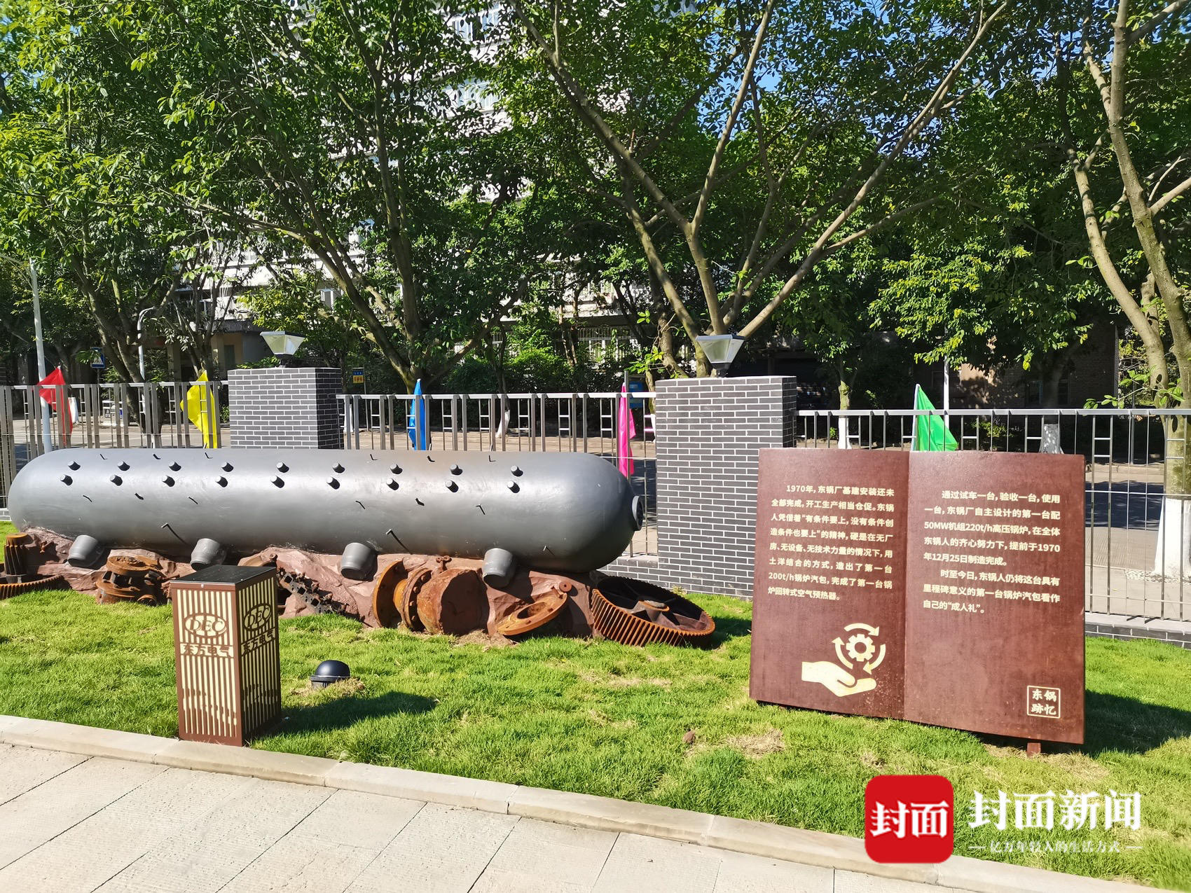 在园里,既有托举主题雕塑,以东方锅炉自主设计制造的第一台5万千瓦锅炉汽包为创作主体,下方通过对旧机器零部件的艺术塑形,形成坚实基座,寓意一代代东锅人艰苦奋斗托举起今天东方锅炉的不断发展,铸就迈向未来的力量。