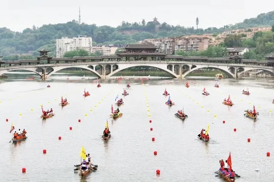 成都周边各区(市)县的非遗民俗主题活动同样热闹非凡。新津南河城区段举办2025“我们的节日·端午”、四川省“百舟竞渡迎端午”集中展演暨新津天府端午龙舟会。金鳞舞龙腾空翻转,激昂鼓乐与巨龙交织,传递国泰民安的祈愿。