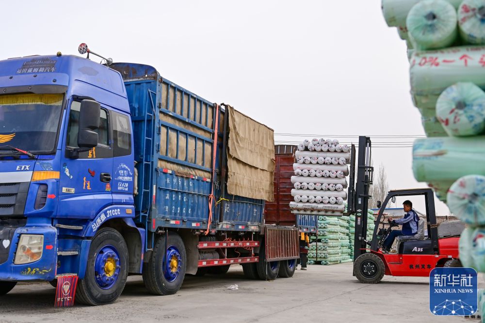 在新疆阿克苏市瑞海农业发展有限责任公司,装卸工将生产的地膜装车(3月23日摄)。