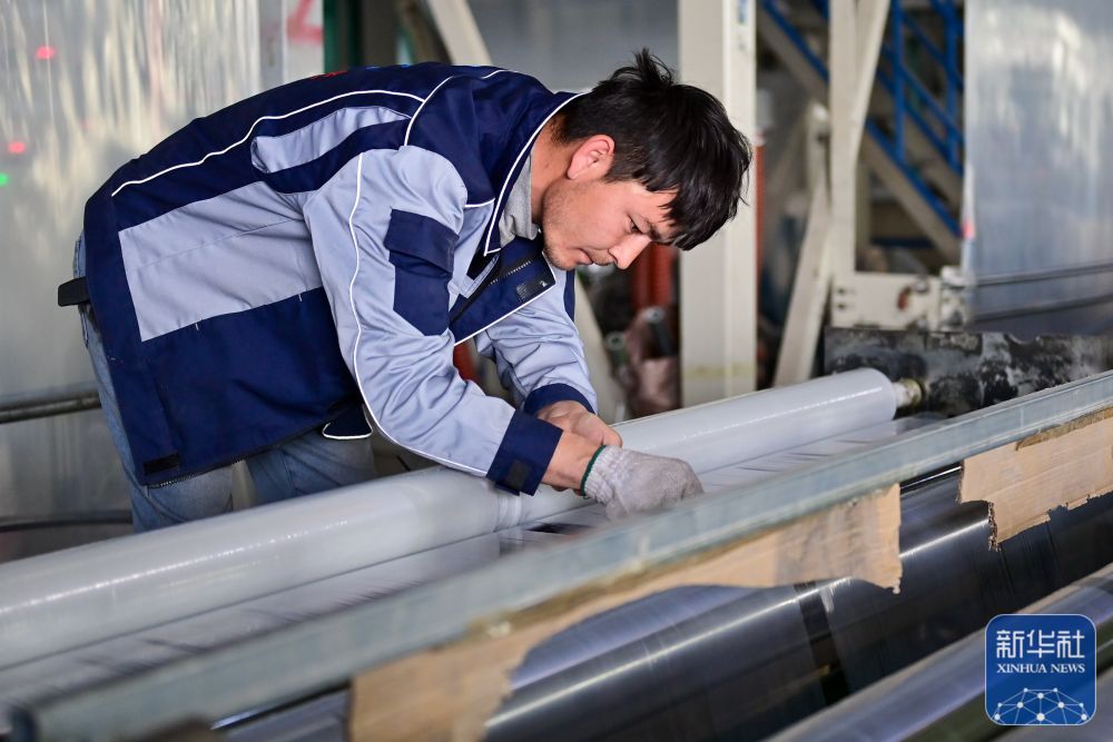 在新疆阿克苏市瑞海农业发展有限责任公司,工人在车间检查生产的地膜(3月23日摄)。