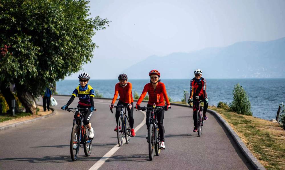4月19日,自行车爱好者沿大理洱海环湖廊道骑行。新华社记者江文耀