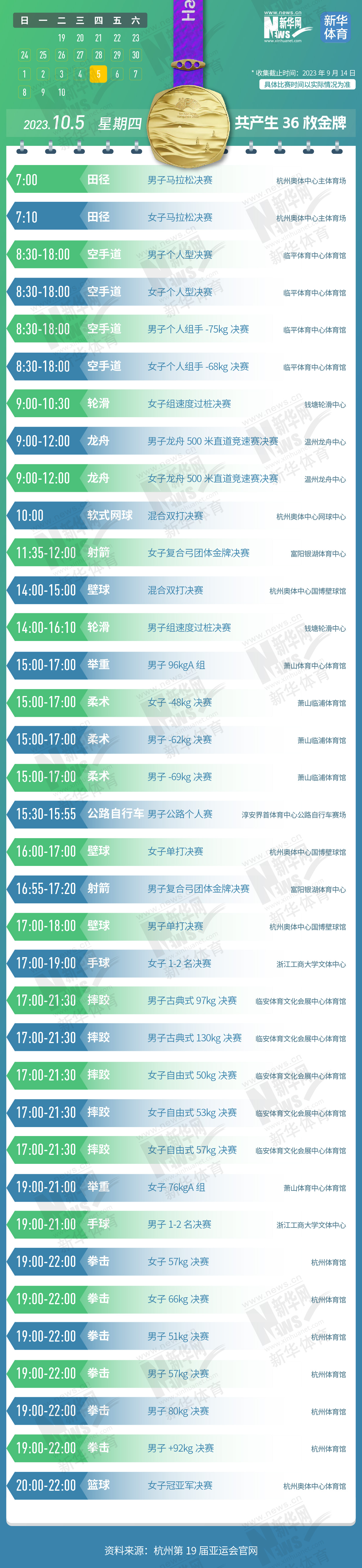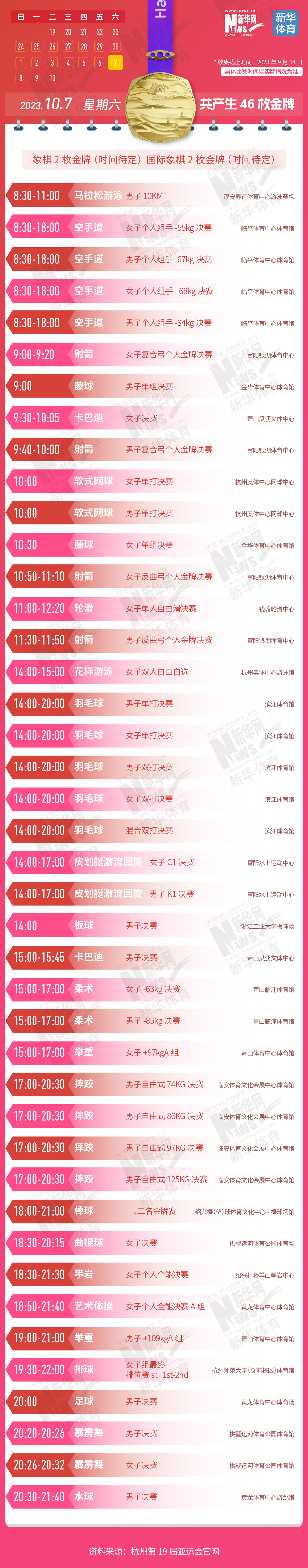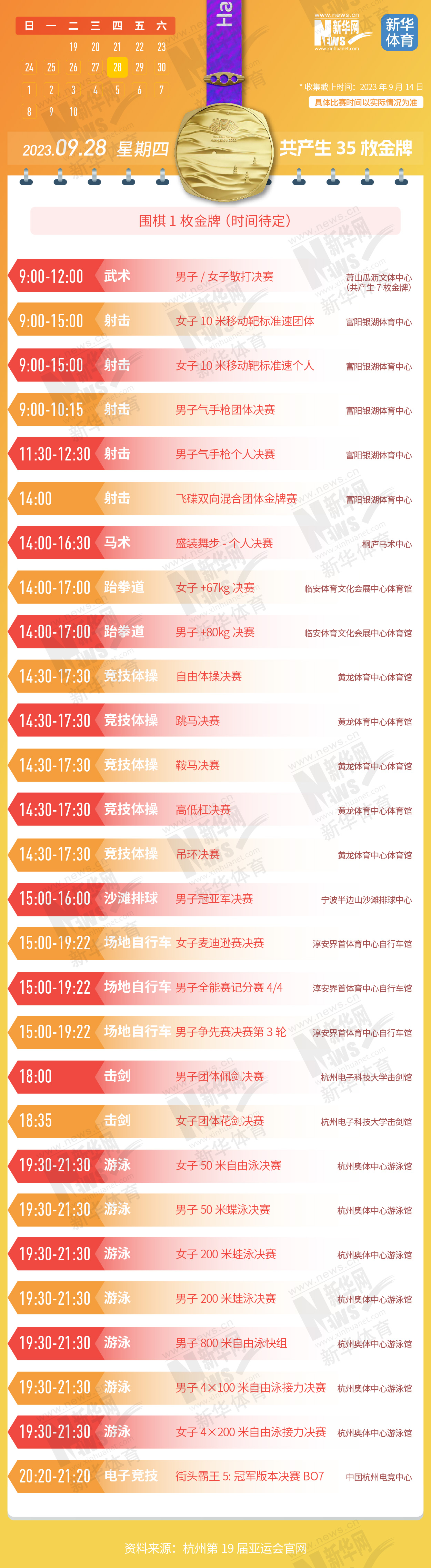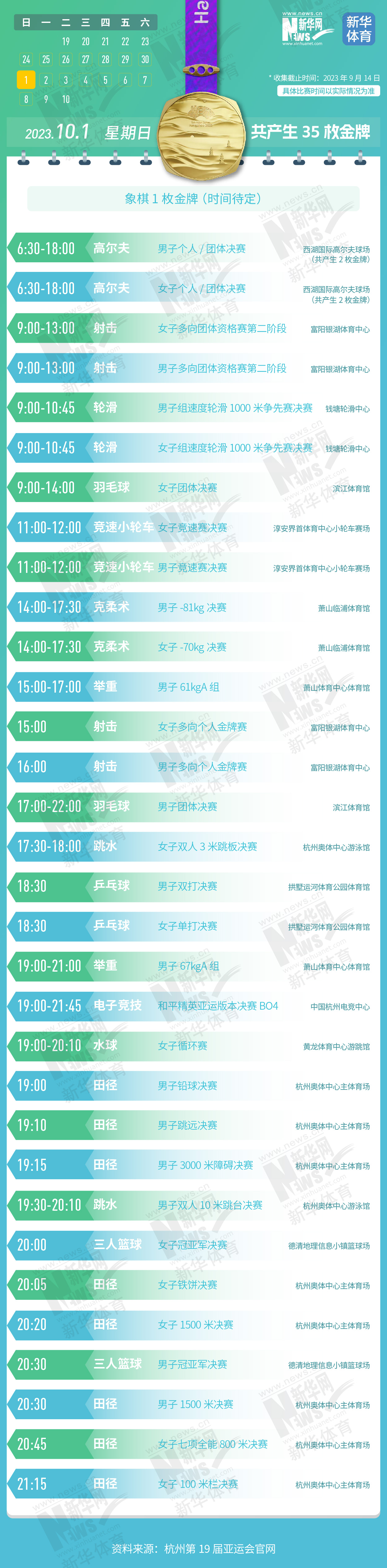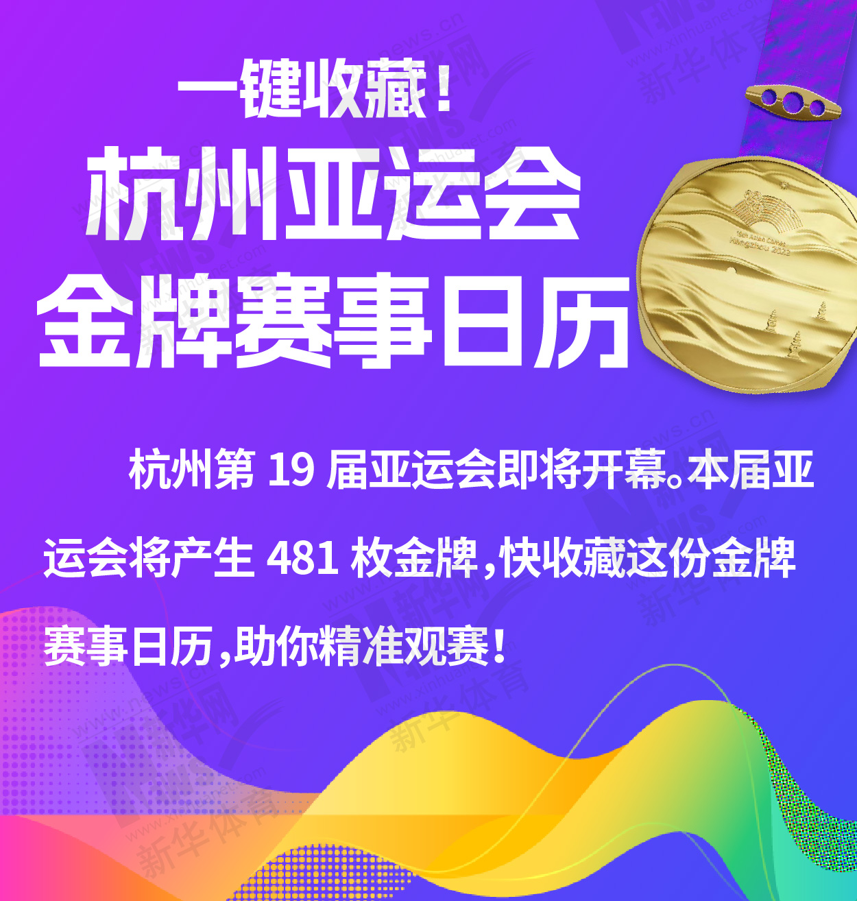 杭州第19届亚运会即将开幕。本届亚运会将产生481枚金牌,快收藏这份金牌赛事日历,助你精准观赛!