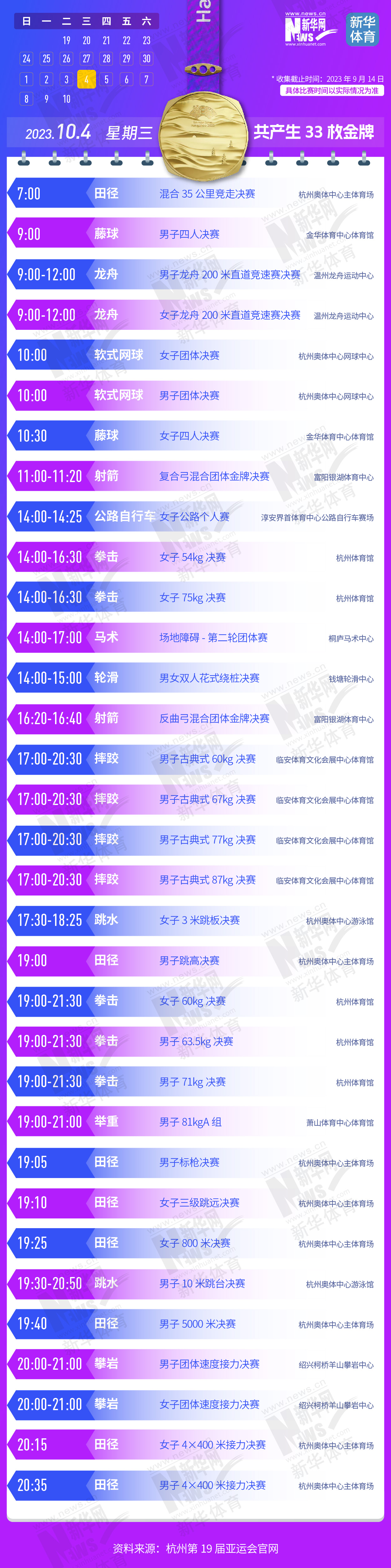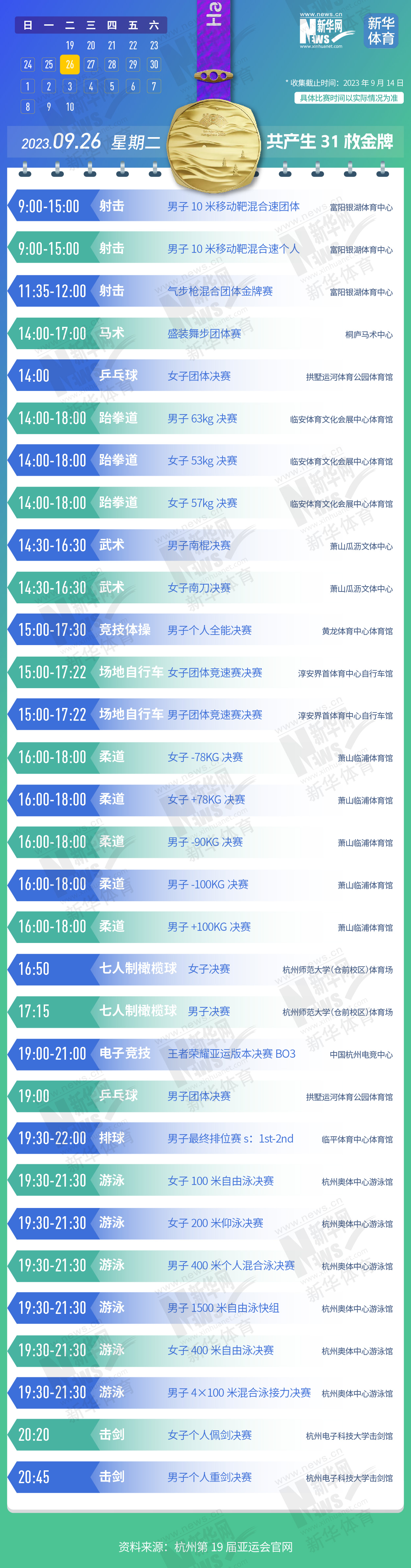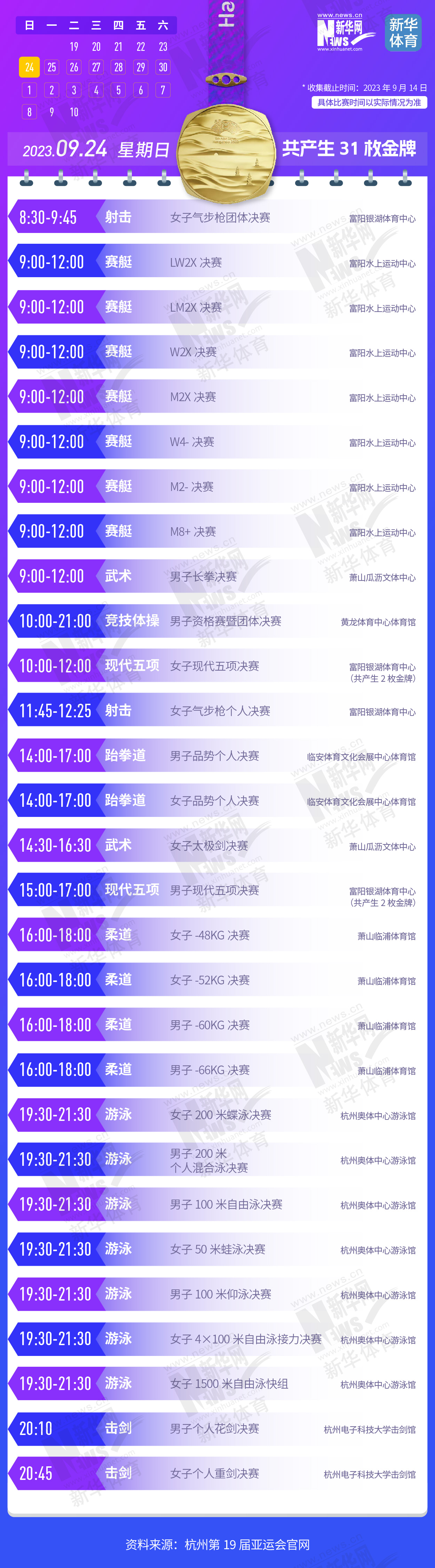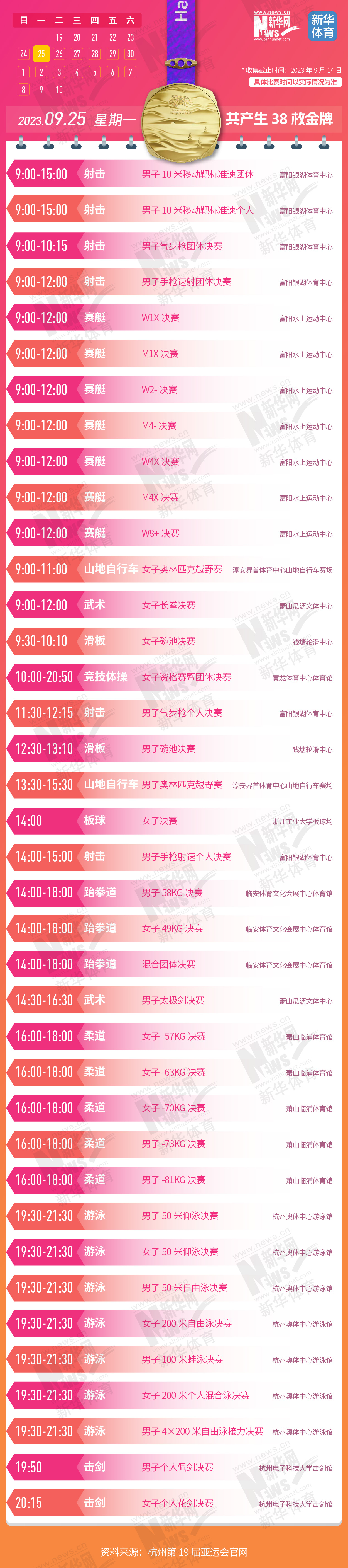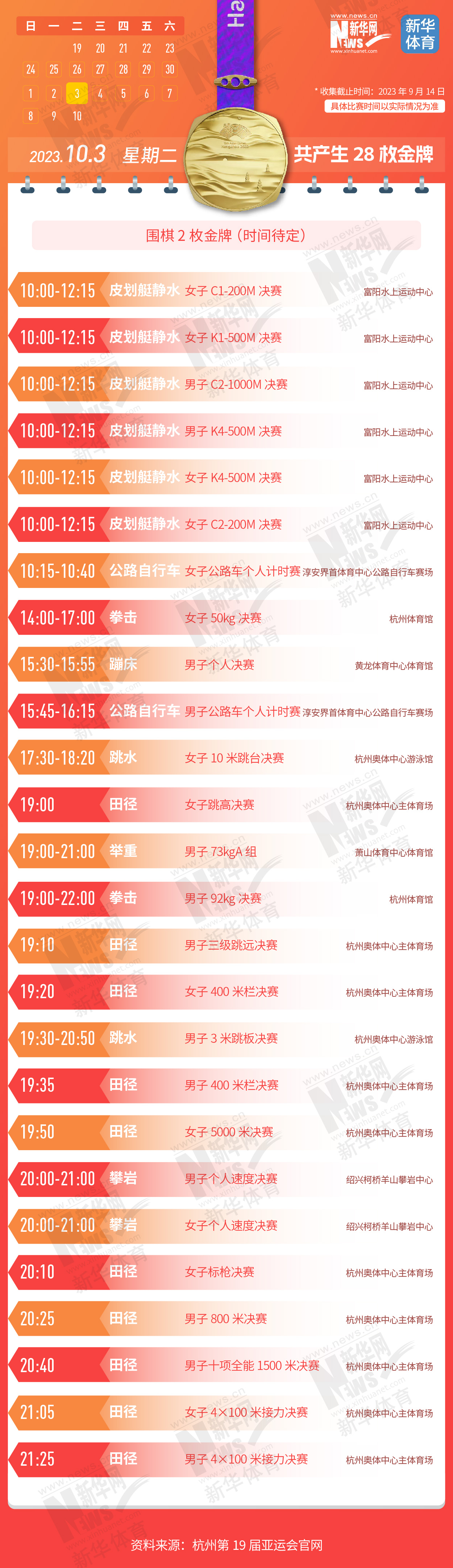 杭州第19届亚运会即将开幕。本届亚运会将产生481枚金牌,快收藏这份金牌赛事日历,助你精准观赛!