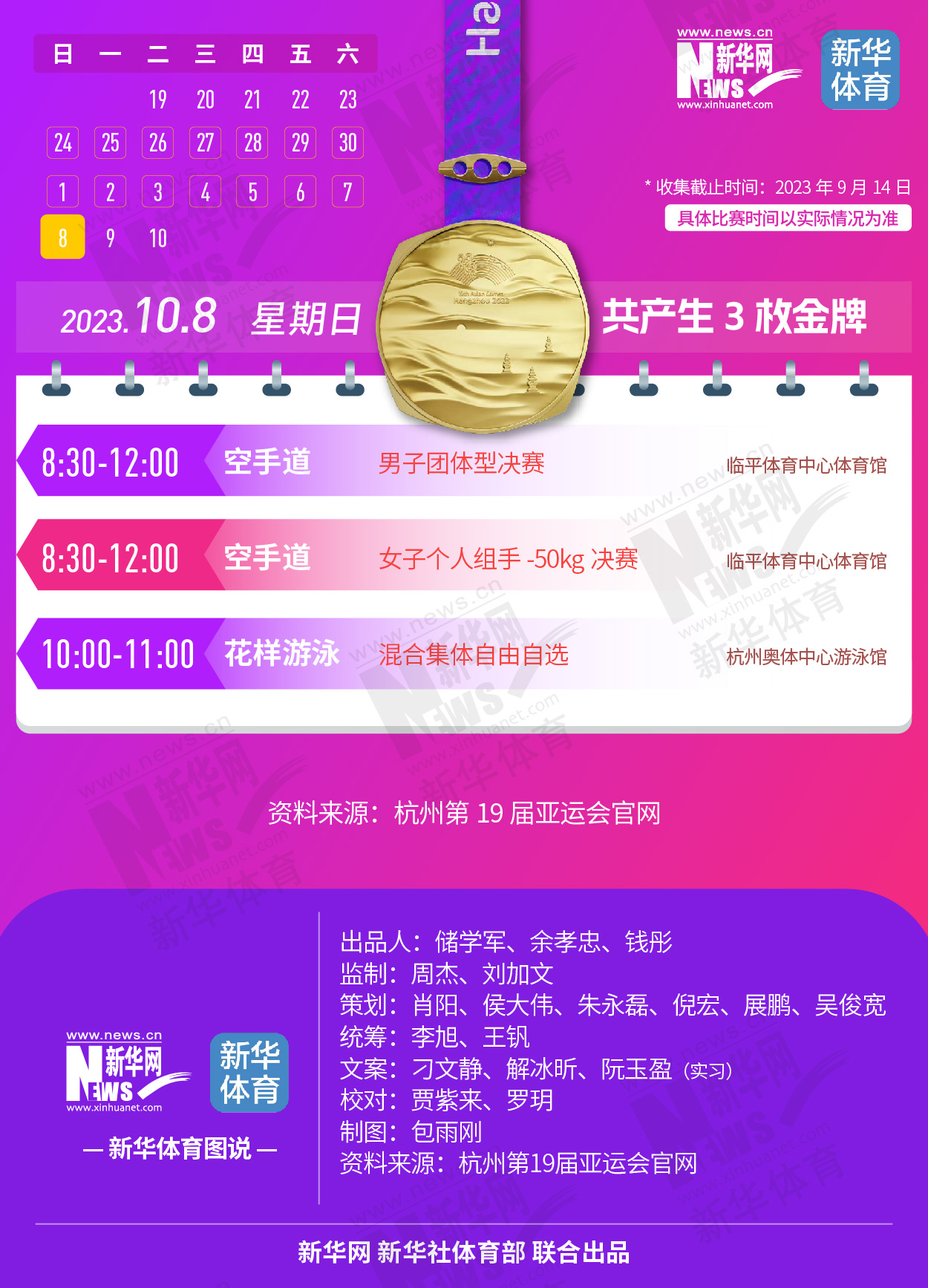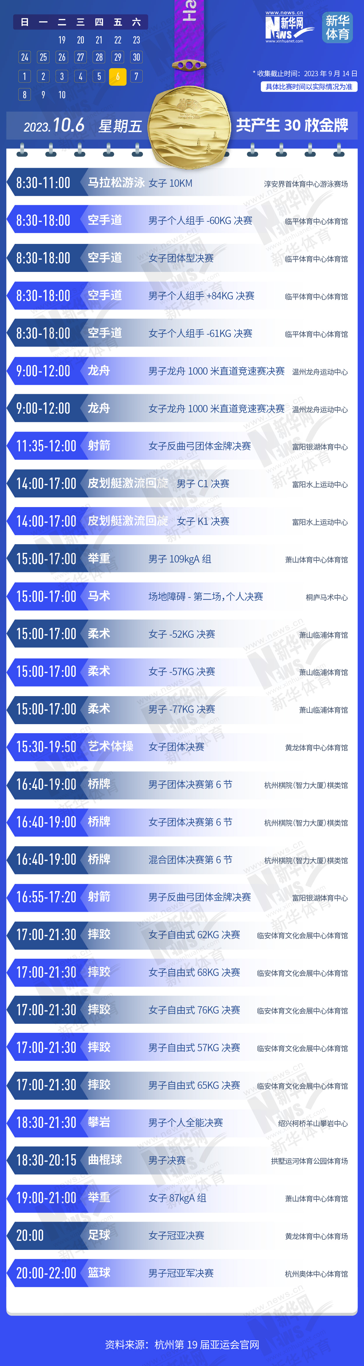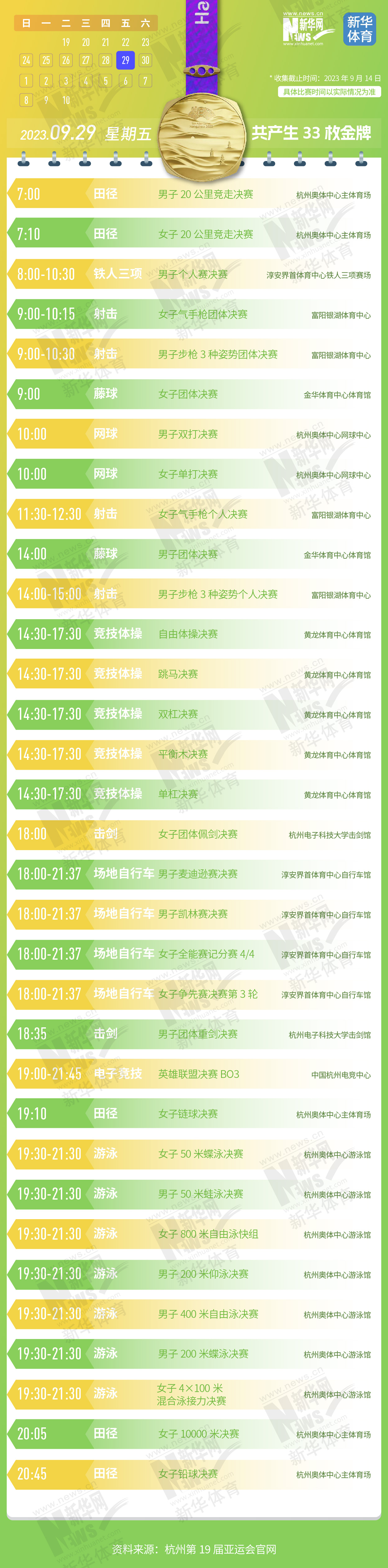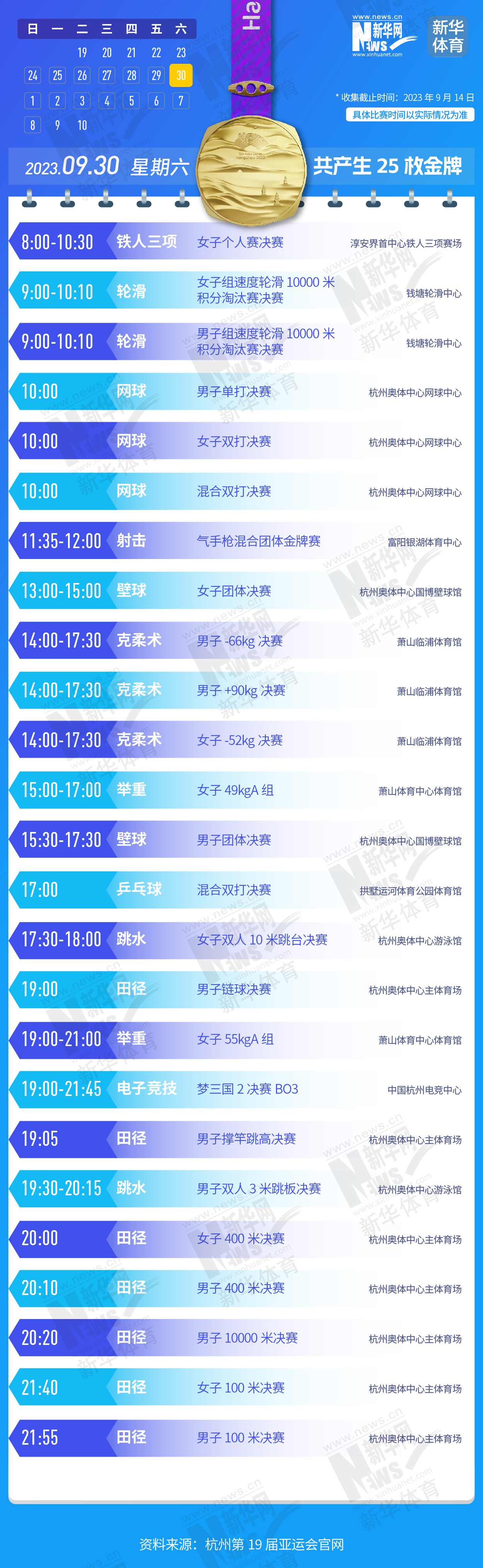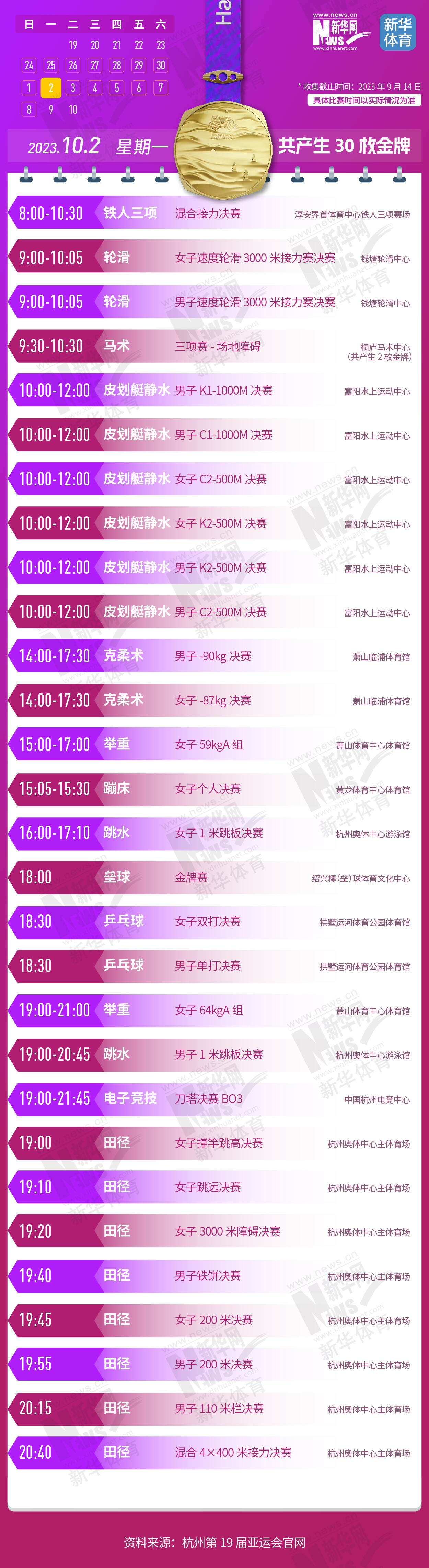 杭州第19届亚运会即将开幕。本届亚运会将产生481枚金牌,快收藏这份金牌赛事日历,助你精准观赛!