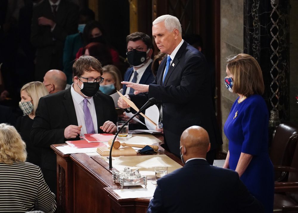 2021年1月6日,在美国华盛顿国会大厦,时任美国副总统彭斯(中)和国会众议院议长佩洛西(右)出席国会联席会议。新华社发(Pool图片,凯文·迪奇 摄)