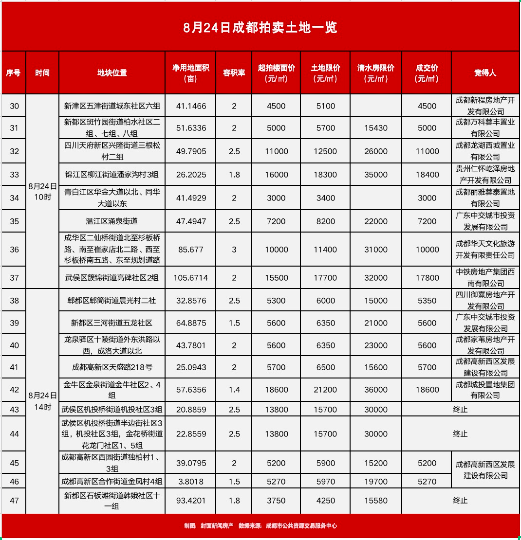 来自成华区杉板桥的约86亩商住用地同样备受关注——地块住宅清水限价31000元/㎡,是成华区首宗清水限价破30000元/㎡的土地。最终地块10000元/㎡底价成交,竞得者为成都华天文化旅游开发有限责任公司。