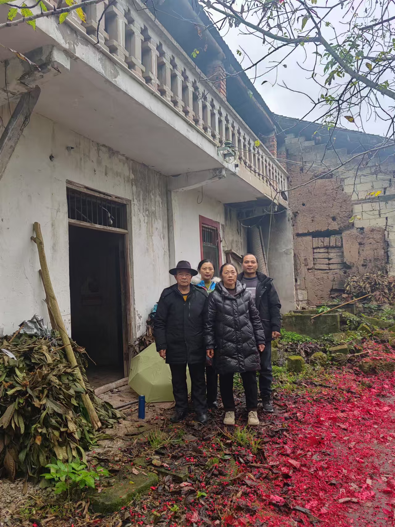 他们还燃放了一长串鞭炮,庆祝李明回家,一家人在老房下合影留念。