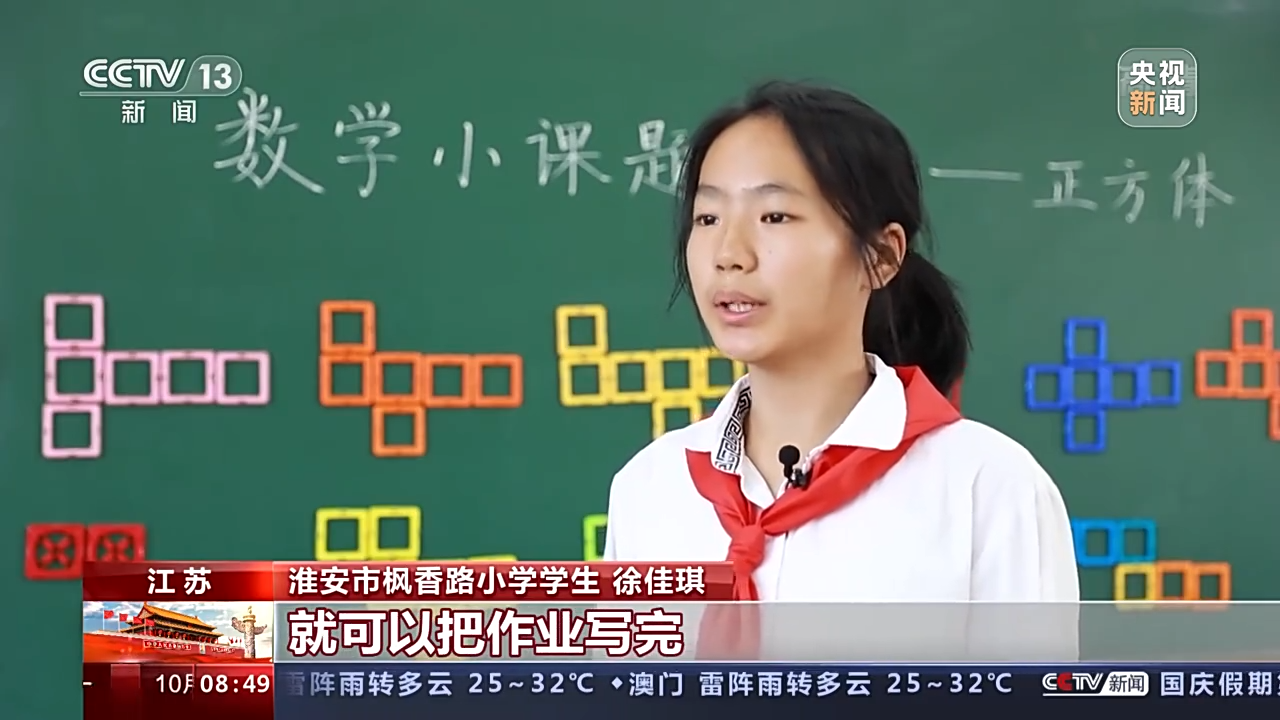 江苏省淮安市枫香路小学学生 徐佳琪:现在我们在学校就可以把作业写完,回到家有更多空余的时间来发展自己的兴趣爱好了。