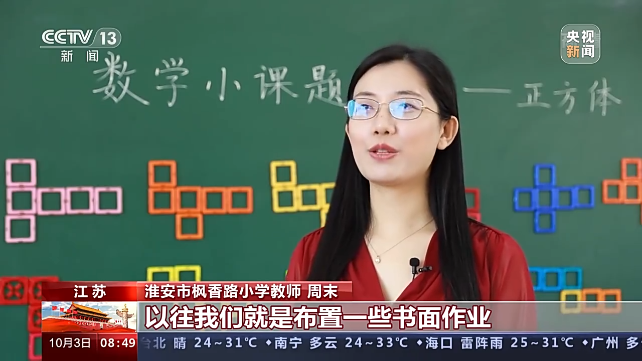 江苏省淮安市枫香路小学教师 周末:以往我们就是布置一些书面作业。“双减”过后,我们学校教研组整合了书本中的单元整体知识,提出了数学小课题研究课,锻炼了学生的空间想象能力。