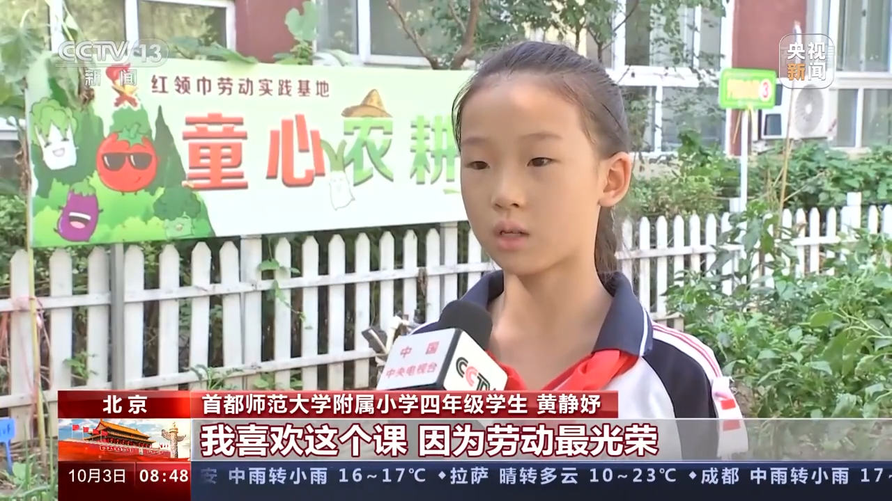 在北京,首都师范大学附属小学在校内开辟小菜园,让萌娃在农耕体验中体悟劳动成果来之不易。