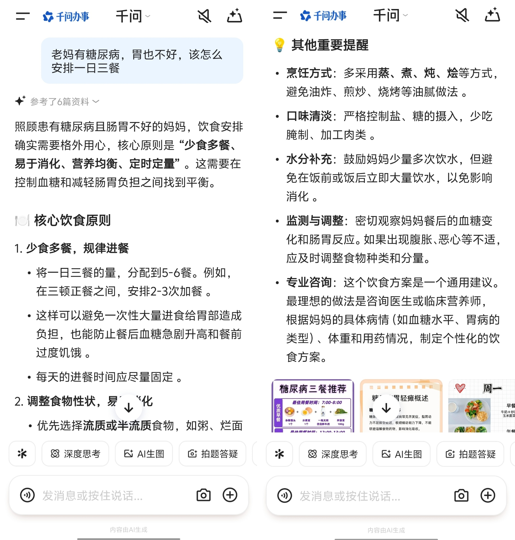 李阿姨今年68岁,糖尿病加上消化功能减弱,每天吃什么成了全家的难题。她儿子给她下载了一个AI应用,输入“老妈有糖尿病,胃也不好,该怎么安排一日三餐”,得到的回答让她儿子有点惊讶——不仅列出了饮食原则,还具体到“早餐可以把白粥换成杂粮粥加鸡蛋羹”“烹饪方式优先蒸煮炖”“蔬菜切细煮软”。