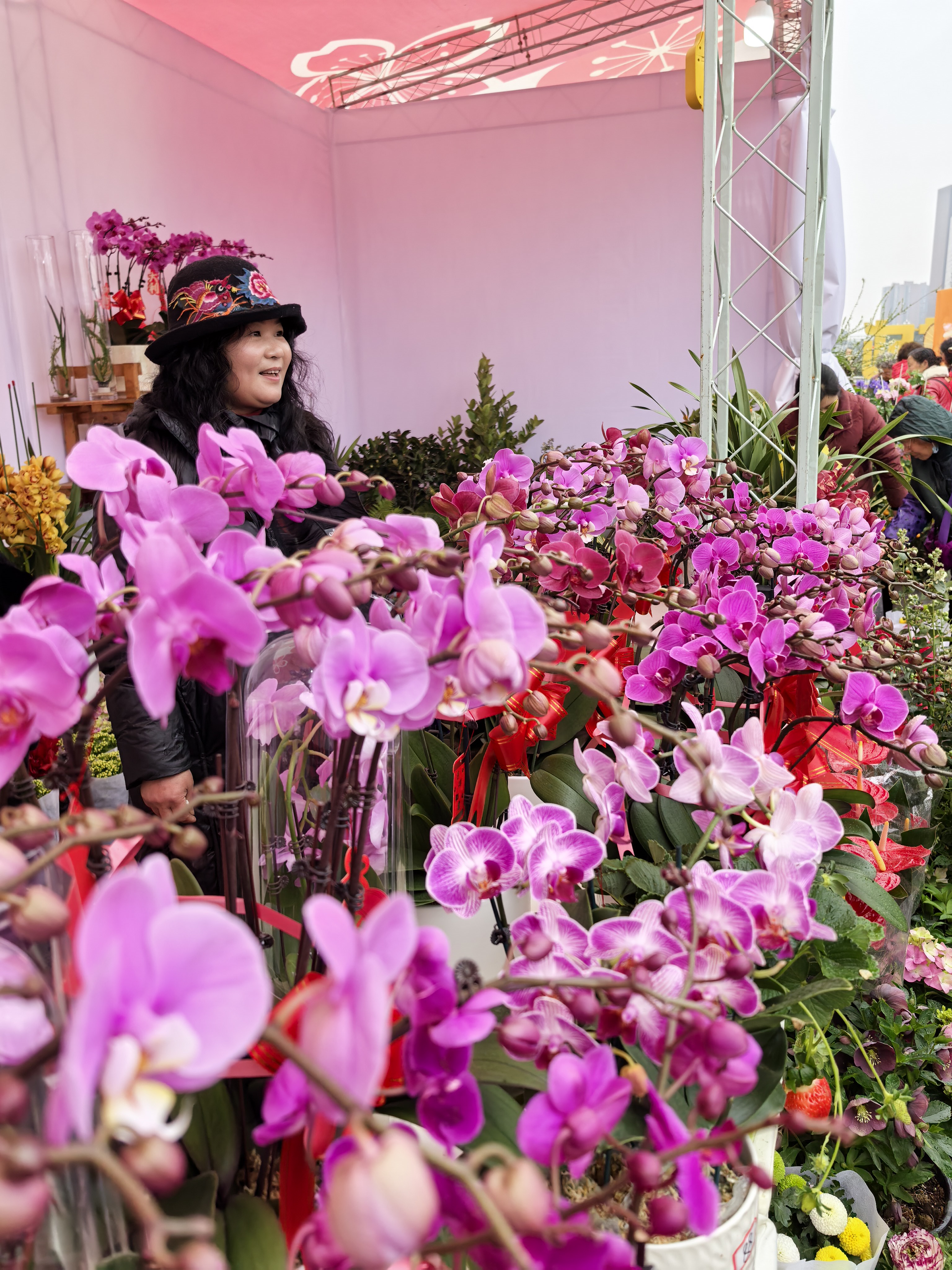 春节前夕,正是年宵花旺季,花卉摊位前,以蝴蝶兰、大花蕙兰、银柳为代表的传统年宵花吸引众多市民游客驻足挑选。市民李女士在现场精心挑选了一盆蝴蝶兰:“本来就计划买盆年花装点下家里,刚好看到集市上年花特别多,价格也实惠,就在这买了!”