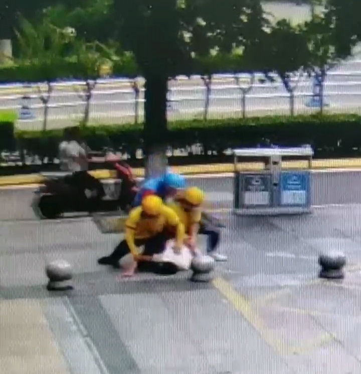 饿了吗外卖骑手廖继伟当时正准备趁着送单的40分钟空隙去吃个饭,正好看到失主、保安和小偷正在拉扯,在小偷挣脱了保安的制服后,他连忙骑着摩托车,冲上去帮忙。