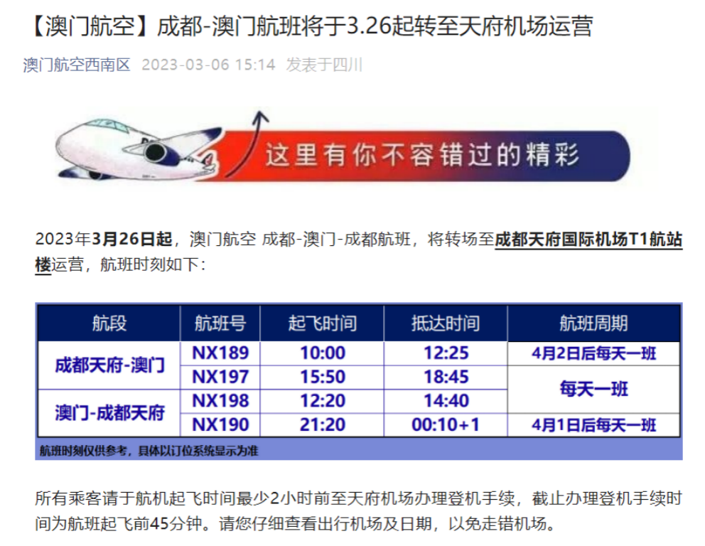 本月26日转场前的澳门航班仍在双流机场运行,针对此前购买的 26 日后双流机场进出港的机票,澳门航空可免费退改。