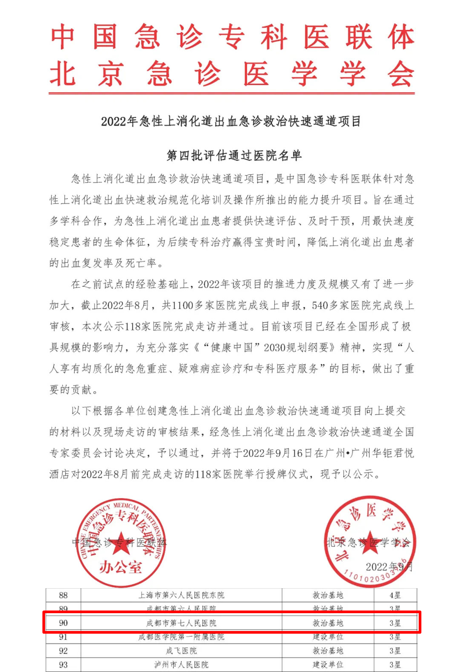 近日,中国急诊专科医联体、北京急诊医学学会公布了“2022年急性上消化出血急诊救治快速通道项目”第四批评估通过医院名单,成都市第七人民医院从全国申报的1100多家医院中脱颖而出,成为全国急性上消化道出血急诊救治快速通道救治基地。