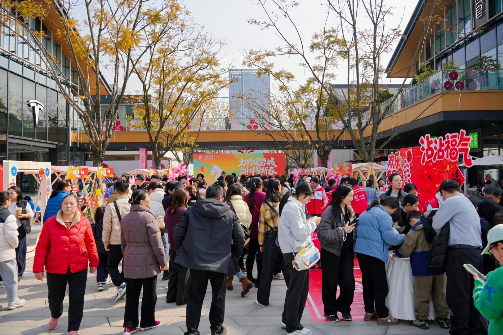 一旁的“文明暖蓉城”集市人流如织。绳编非遗代表性传承人手指翻飞,一只只精巧的中国结跃然掌心;面人师傅搓捏点画,不到三分钟,一匹栩栩如生的“枣红马”便立于竹签之上。书法送福摊位前排起长队,成都市书法家协会的姚正洁挥毫不停。