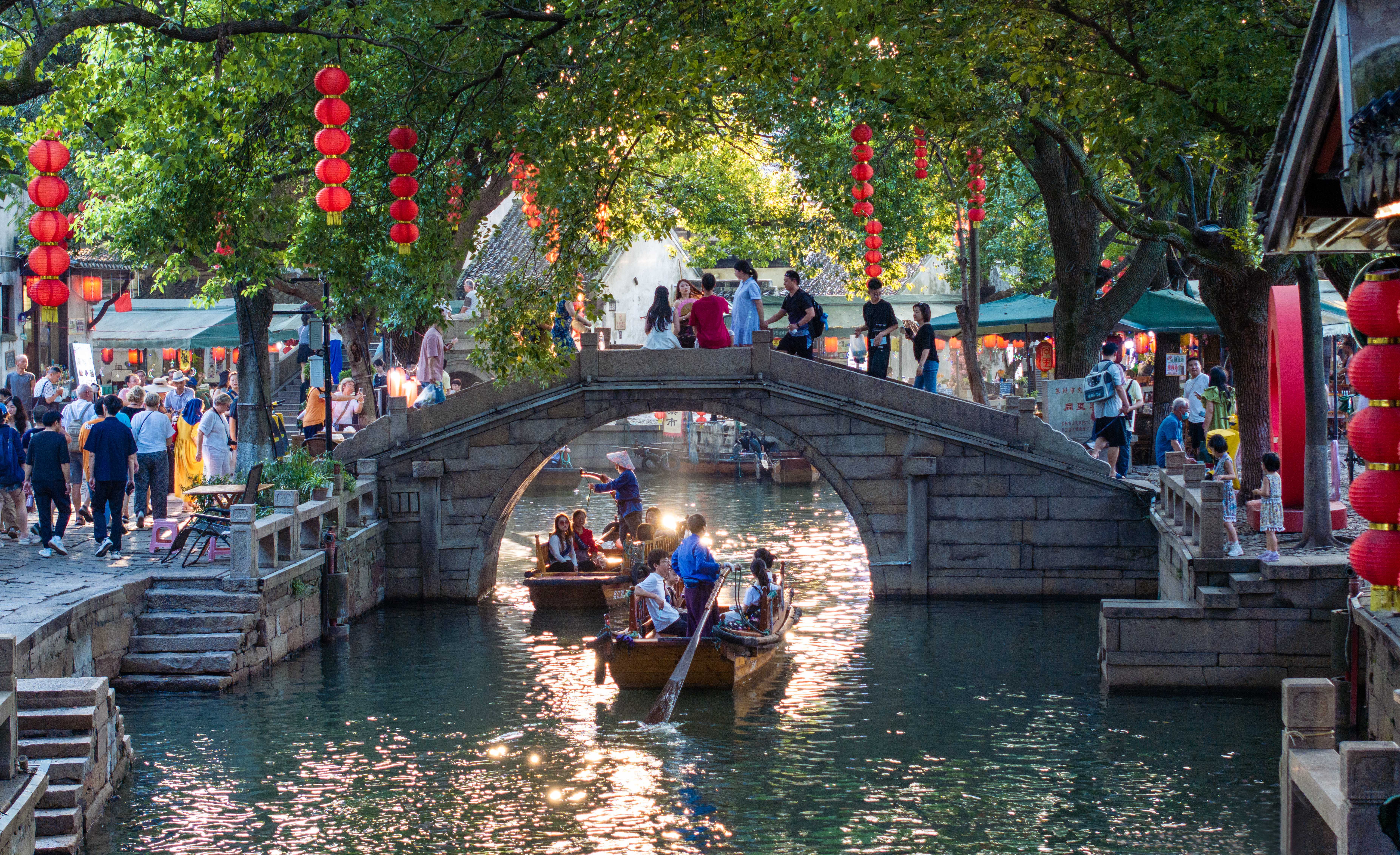 10月6日,游客在江苏省苏州市吴江区同里古镇游览(无人机照片)。新华社发(周社根摄)