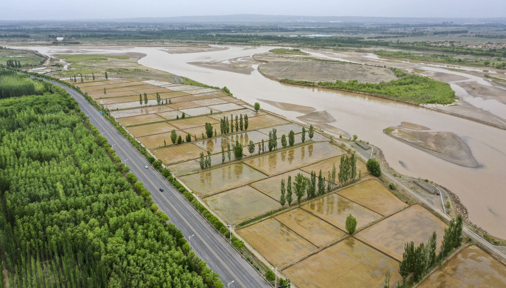 流经宁夏青铜峡市境内的黄河,滋润着岸边水稻和各种植被(无人机照片,5月25日摄)。新华社记者冯开华 摄