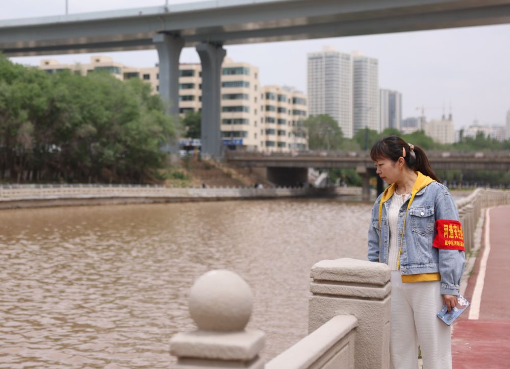 6月3日,在西宁市南川河沿岸,社区河长蒋晓芸正在巡河。新华社记者李宁 摄