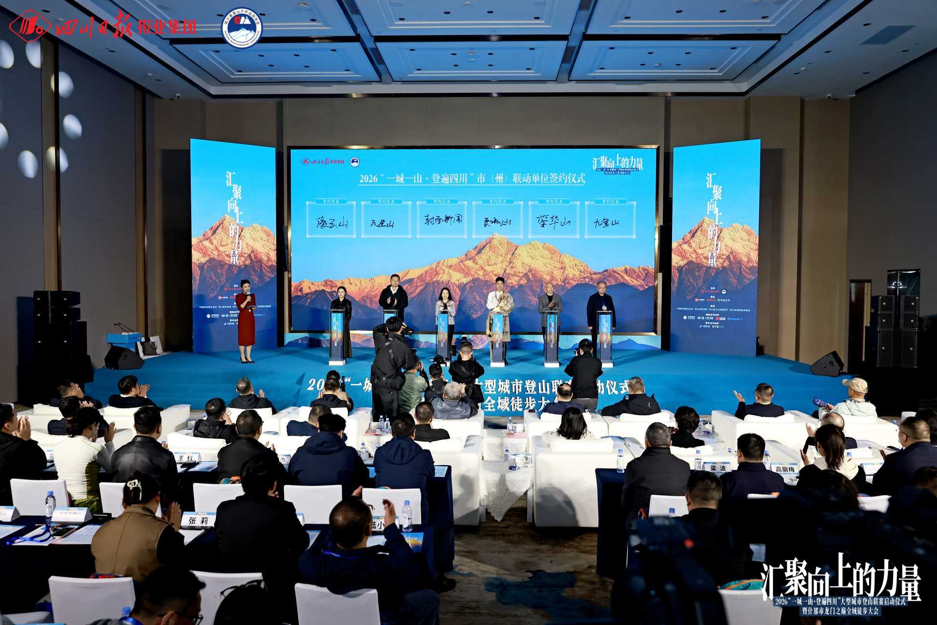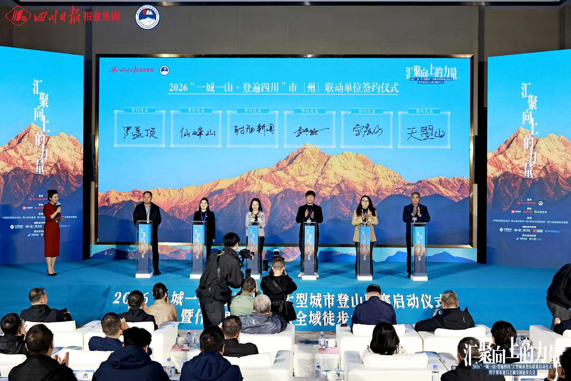 3月31日,在德阳什邡举行的2026“一城一山·登遍四川”大型城市登山联赛启动仪式暨什邡市龙门之巅全域徒步大会上,2026“一城一山·登遍四川”市(州)联动单位签约仪式举行。全省21市州的地标山峰在这场全民攀登盛宴中次第点亮,连缀成属于四川最壮丽、最动人的山河画卷。