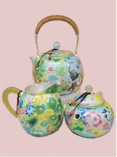谭志平设计的茶具作品“彩银之蓝”,包含花朵、大象、孔雀等云南特色元素。受访者供图 本版照片除标注外均为朱远灵拍摄