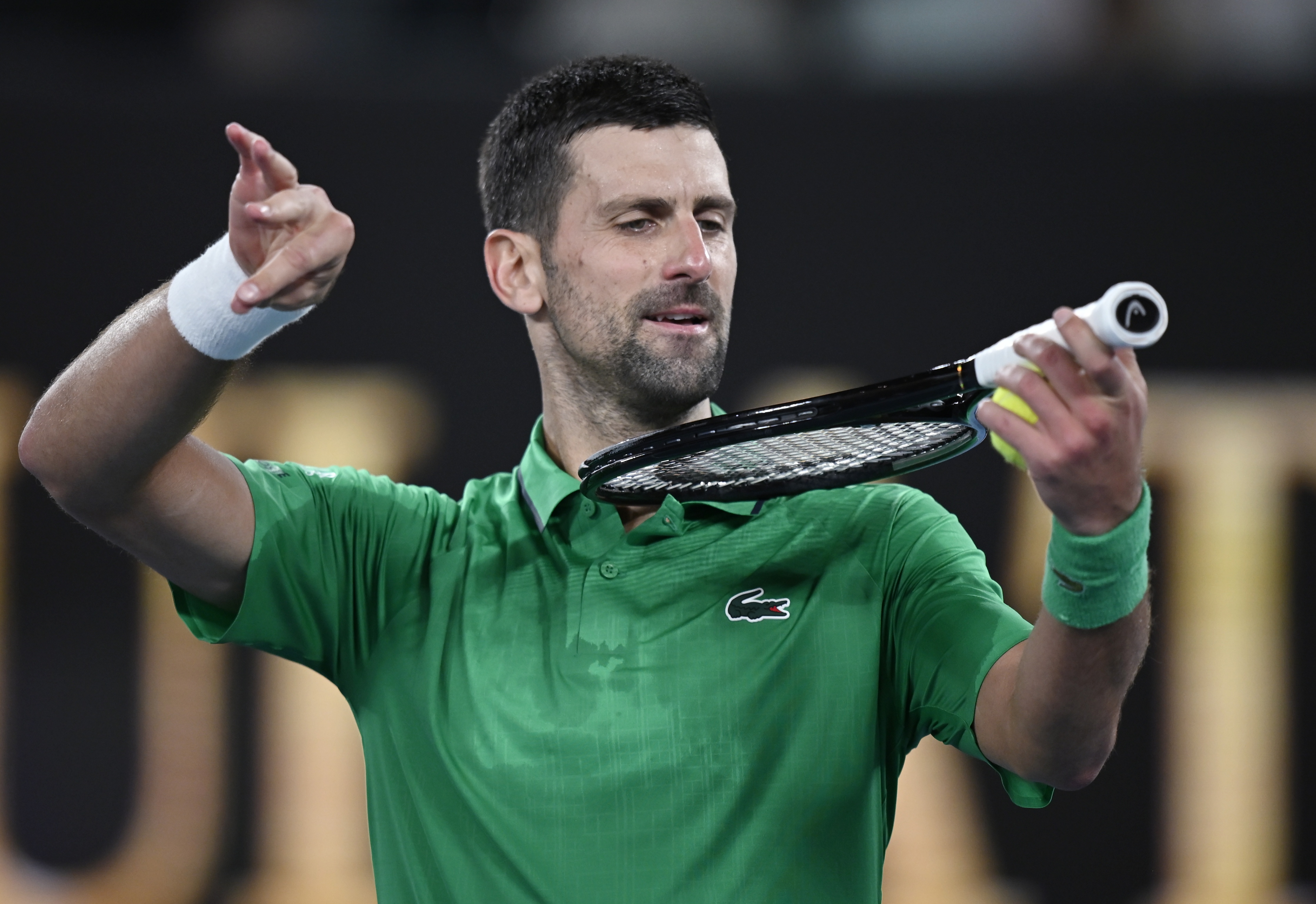 1月24日,焦科维奇在获胜后做出拉小提琴的动作庆祝。新华社发(王申 摄)