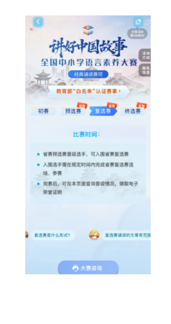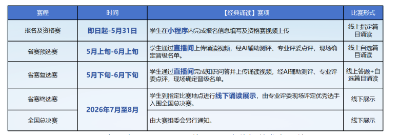 “讲好中国故事”全国中小学语言素养大赛(经典诵读)四川省赛区覆盖小学至高中全学段,设四个组别。赛程即日起至8月,分为线上初赛、省赛预选赛、复选赛、终选赛及全国总决赛。