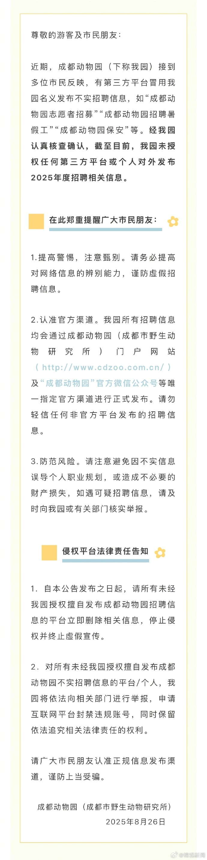 经核查确认,截至目前,成都动物园未授权任何第三方平台或个人对外发布2025年度招聘相关信息。