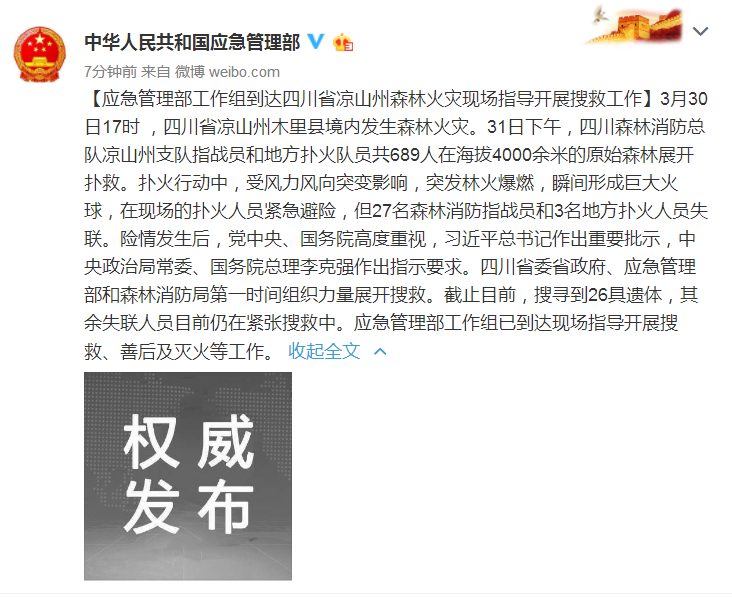 险情发生后,党中央、国务院高度重视,习近平总书记作出重要批示,中央政治局常委、国务院总理李克强作出指示要求。四川省委省政府、应急管理部和森林消防局第一时间组织力量展开搜救。截至目前,搜寻到26具遗体,其余失联人员目前仍在紧张搜救中。应急管理部工作组已到达现场指导开展搜救、善后及灭火等工作。