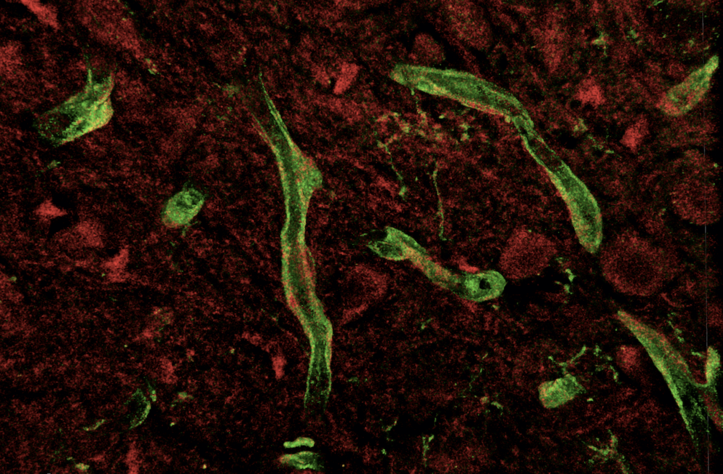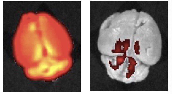 ▲ 大脑血管局部放大图显示,红色的模式药物被递送到大脑里