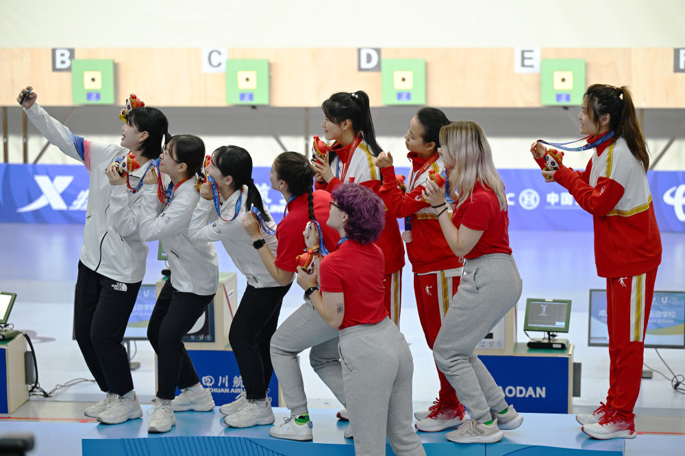 7月29日,大运会射击女子10米气步枪团体前三名选手在颁奖仪式上合影。新华社记者 刘坤 摄
