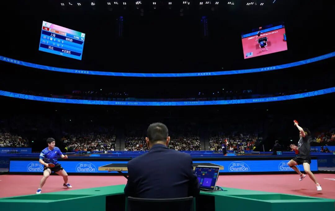 12点34分,多哈世乒赛男单冠军、北京队选手王楚钦,乒乓球大满贯、上海队选手樊振东先后入场,现场球迷的欢呼声此起彼伏。十五运会乒乓球项目男单半决赛,曾经和现在的世界第一即将上演“强强对话”。