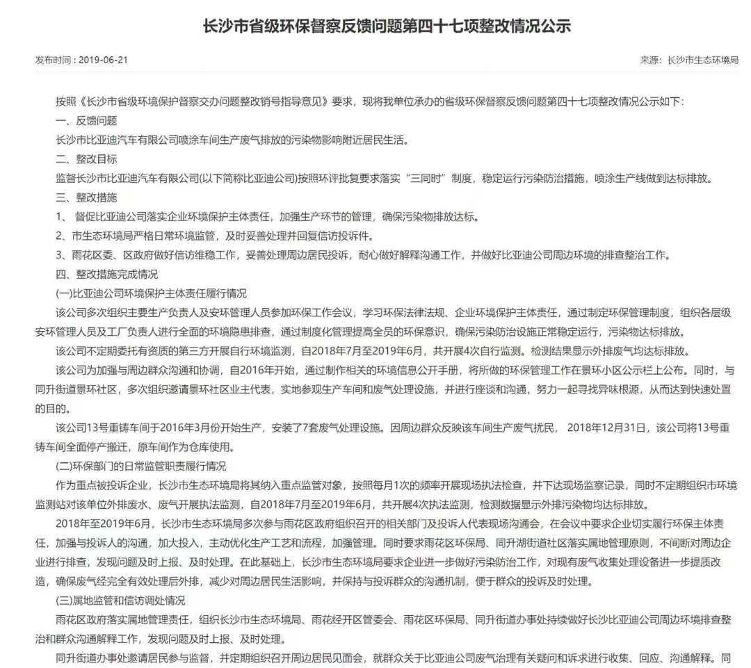 早在2019年,就有周边居民反映长沙比亚迪气体排放污染周围空气,还被党史湖南省生态环境督查列为整改事项。