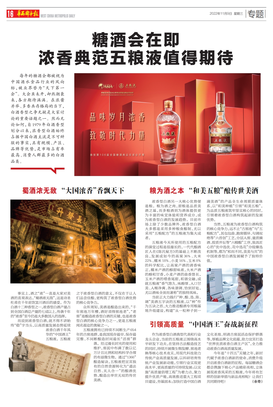 当前正大力践行“种、酿、选、陈、调”美酒五字诀的五粮液,以“种”作为五诀之首,大力推进酿酒专用粮基地升级建设,构建“从一粒种子到一滴美酒”的产品全生命周期质量体系,以“和美种植”引领“和美五粮”,为品质五粮液筑牢坚实核心的同时,引领着浓香型白酒构筑起新的发展优势。