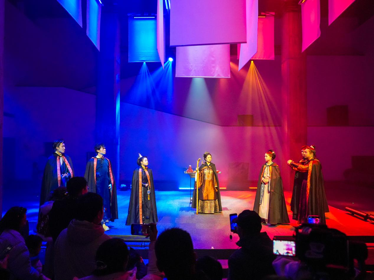 夜幕降临,苏州御窑金砖博物馆里的数字艺术装置亮起,一场流光溢彩的视觉盛宴拉开帷幕——身着特色服装的演艺人员,在入口处为游客送上“定制装备”,随后带着他们化身“寻砖人”,进入一场沉浸式“剧本杀”。
