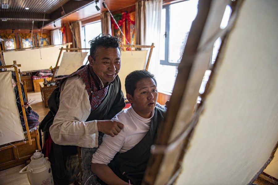 图为3月9日,在日喀则唐卡画院,老师洛桑旦达在教授学生唐卡绘画技巧。新华社记者 孙非 摄