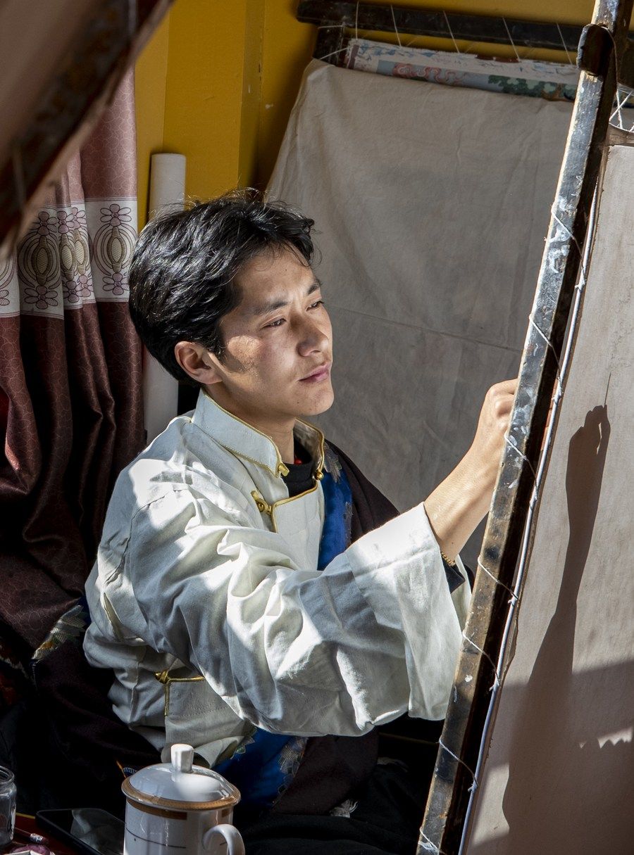 21岁的巴桑普赤是画室里唯一的女学徒。去年从拉萨师范学院毕业后,爱好绘画的她来到画院学习。“家人也很支持我,而且我也可以一边学画,一边准备公务员考试。”