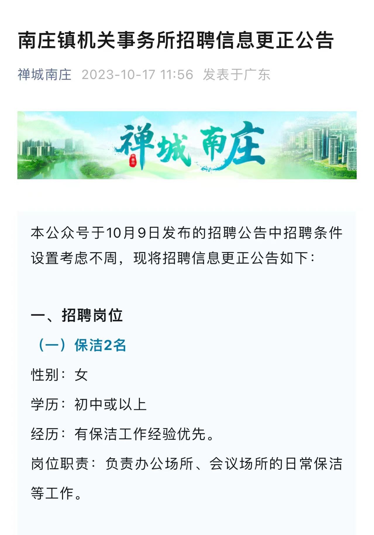 10月17日,南庄镇机关事务所相关工作人员向央广网记者表示,“禅城南庄”微信公众号于10月9日发布的招聘公告中,有关招聘条件设置考虑不周,现已将招聘信息进行更正。根据佛山市禅城区南庄镇人民政府官方网站以及“禅城南庄”发布的最新公告,南庄镇机关事务所有关保洁的招聘岗位中,目前已将年龄和身高要求两项删除,岗位职责改为“负责办公场所、会议场所的日常保洁等工作”。