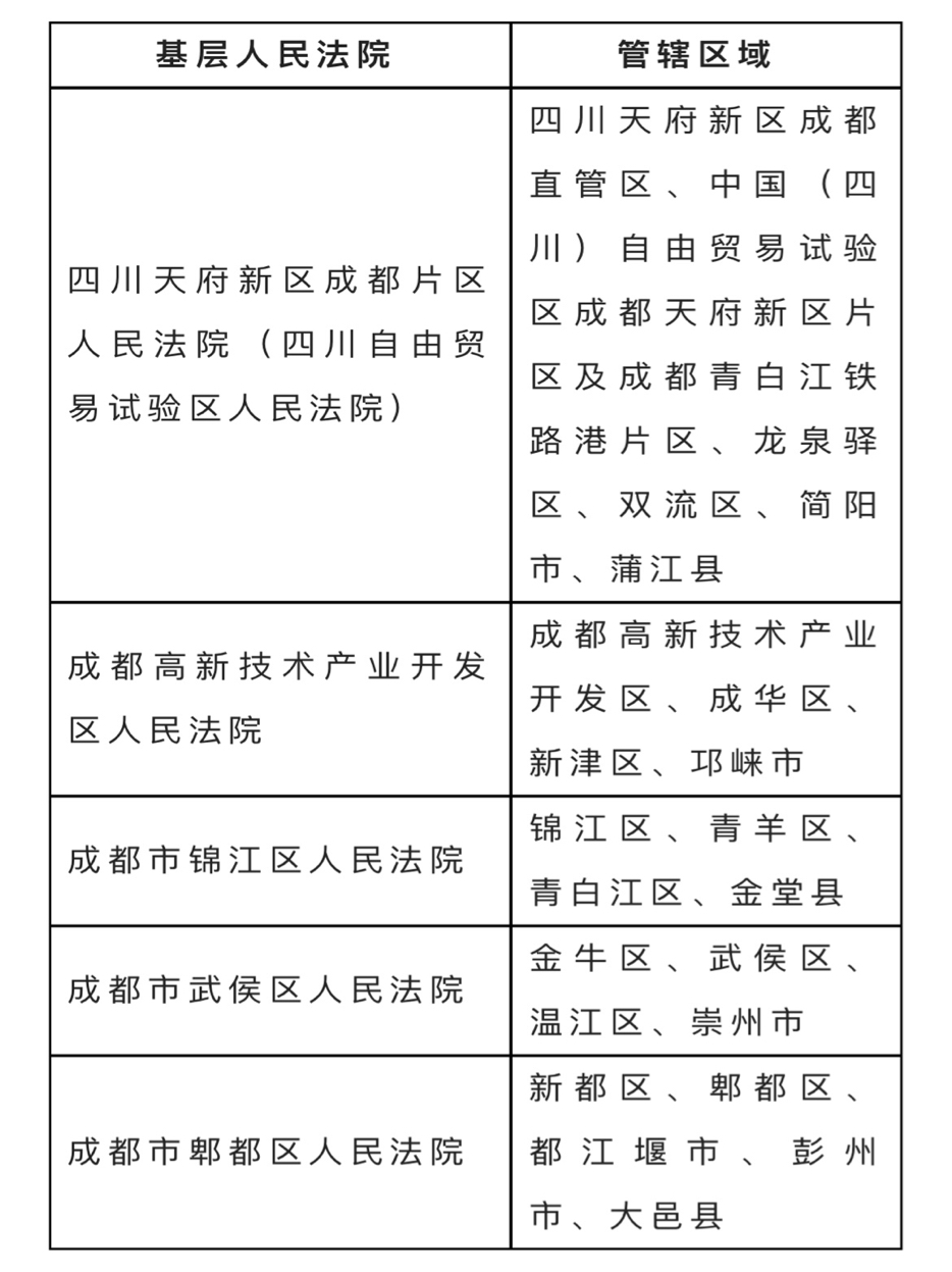 一是四川天府新区成都片区人民法院(四川自由贸易试验区人民法院)等5个基层人民法院跨区域集中管辖相应辖区内的第一审知识产权民事、行政案件(具体名单和管辖区域见附件),但是依照本公告由上级法院管辖的除外。
