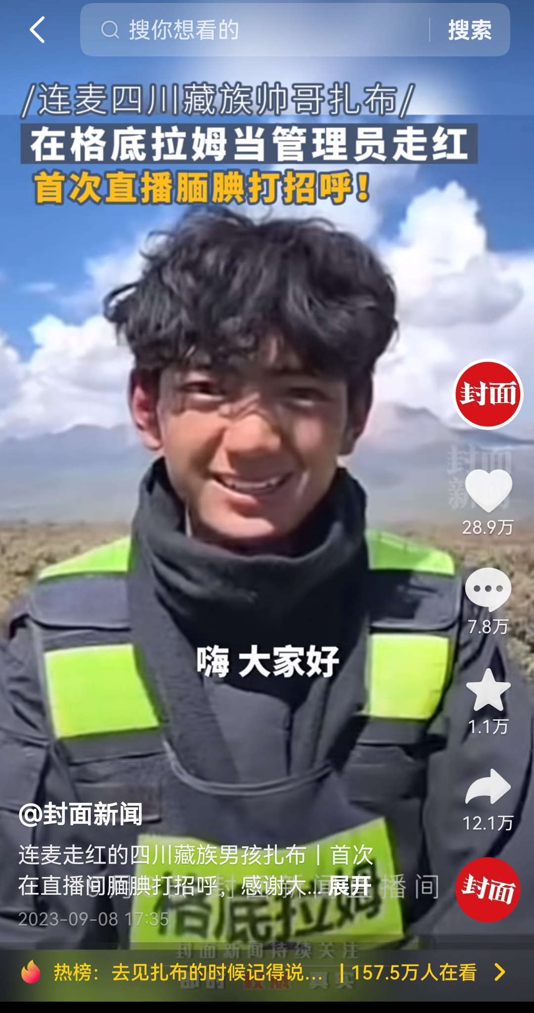 9月8日下午3点,因颜值走红的四川康定藏族小伙扎布在抖音进行了直播首秀。该场直播由封面新闻联合抖音《当事人会客厅》发起,虽然总时长不到一小时,仍然吸引了近60万网友围观。不仅如此,当天的直播内容还引发了更多网友关注,相关内容总浏览量超千万。